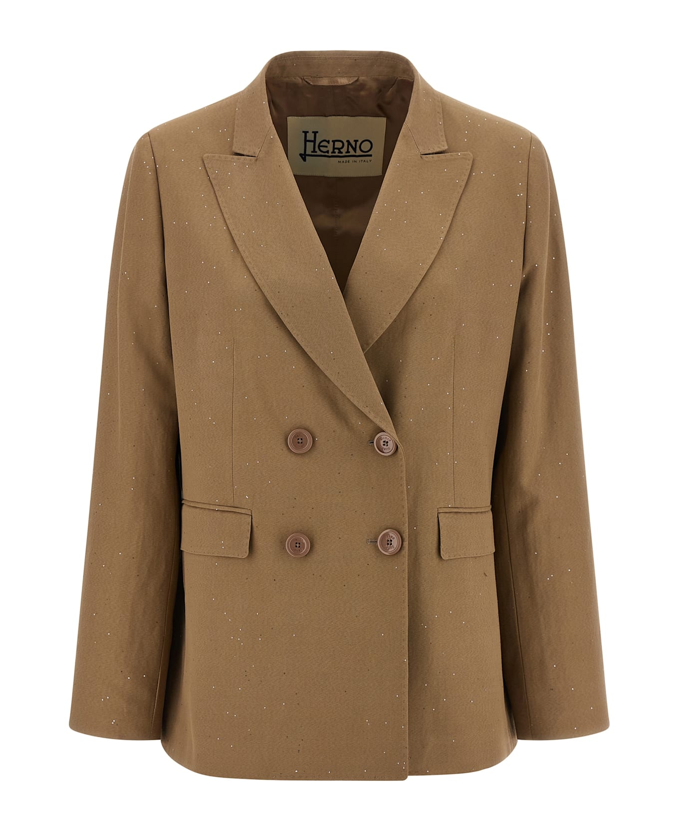 Double-breasted blazer in viscose and linen blend with all-over micro sequin appliqué, front button closure, peak lapels, flap pockets, slightly padded structured shoulder strap, long sleeves, back split, and viscose lining.