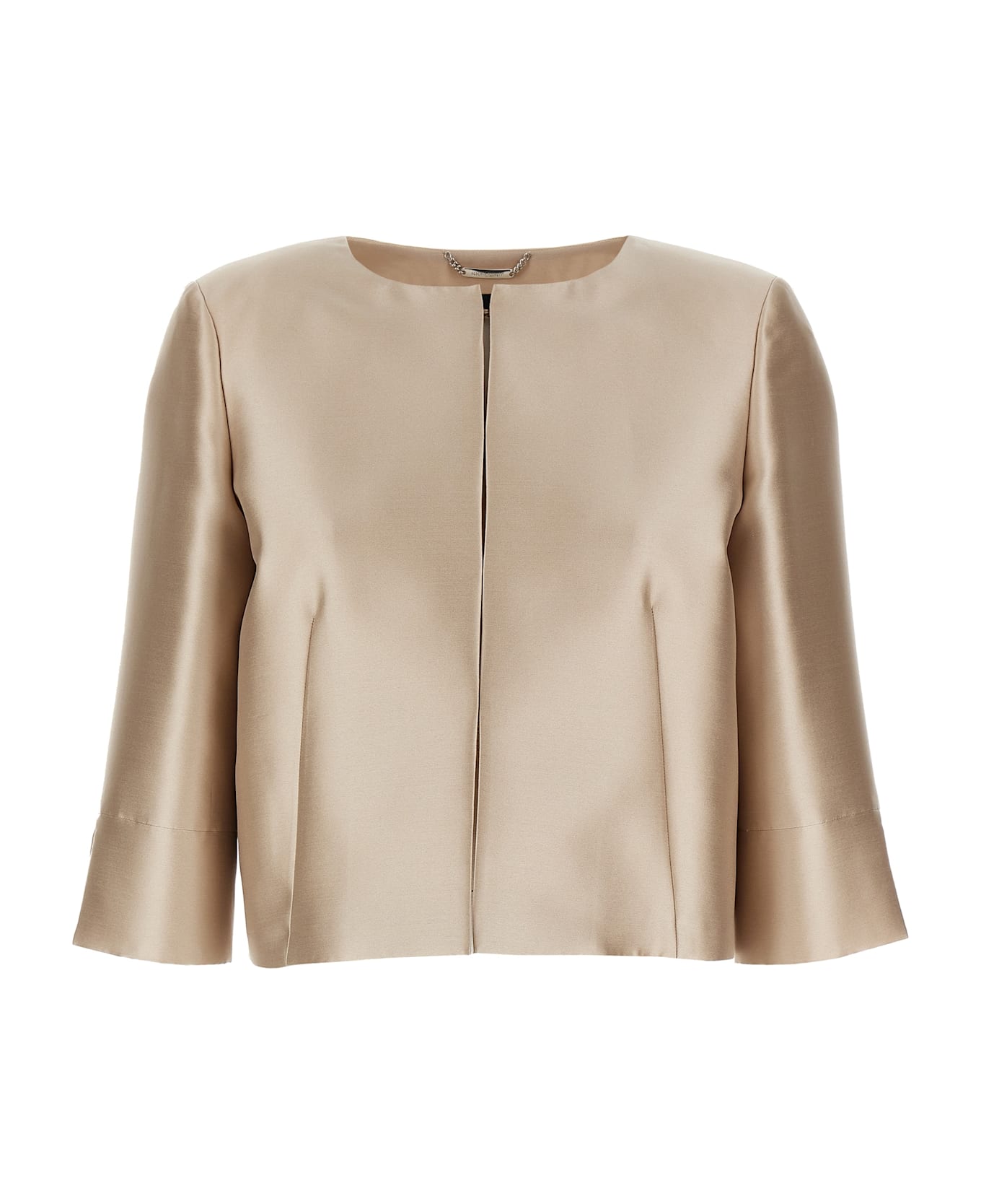 Bolero cropped jacket in mikado, crew neck, front hook closure, three-quarter sleeves with split at the bottom.