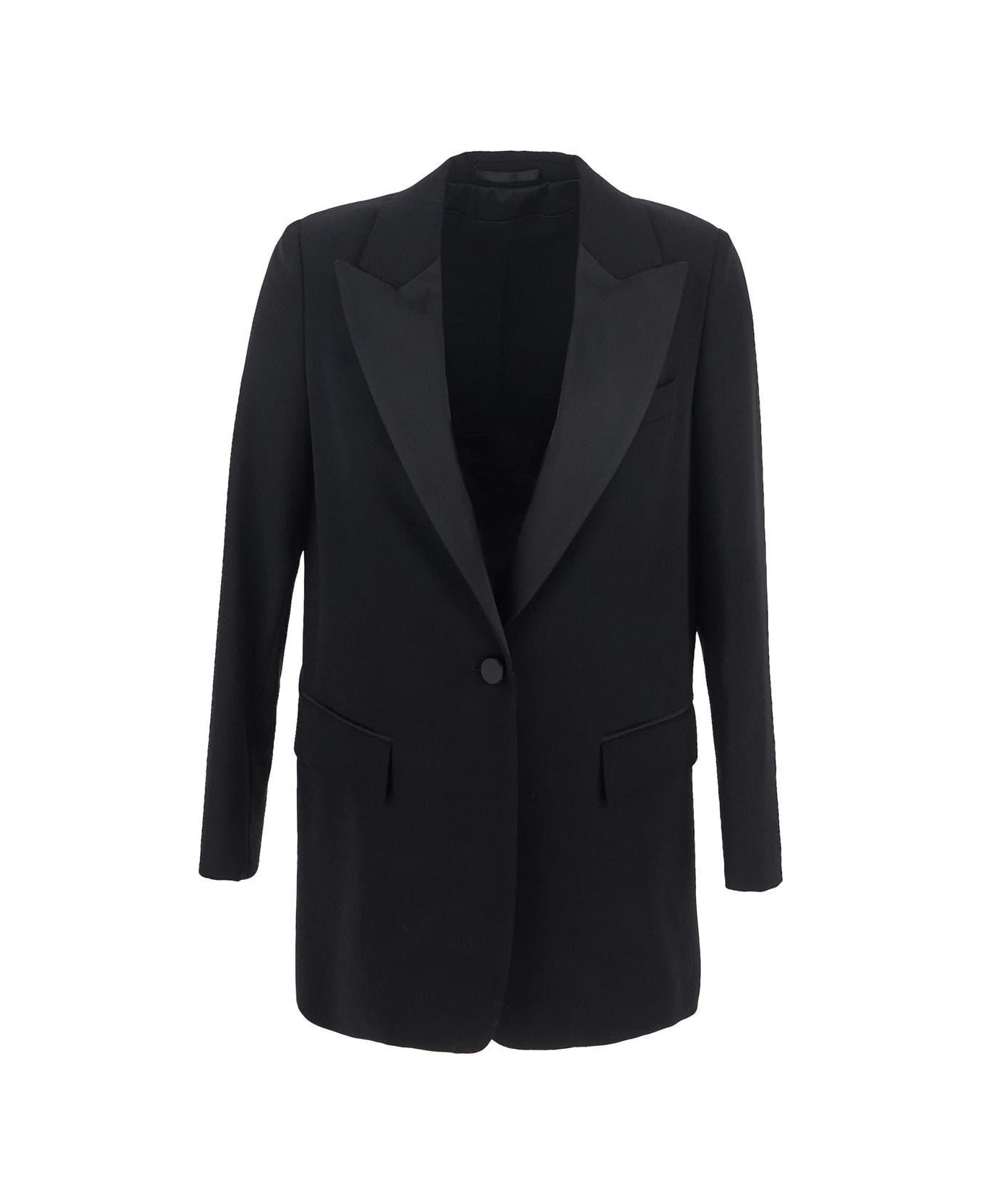 Max Mara jacket in black virgin wool with shiny lapel collar. The item is featured by a single-breast closure with button, two front pockets with flaps and two back slits.