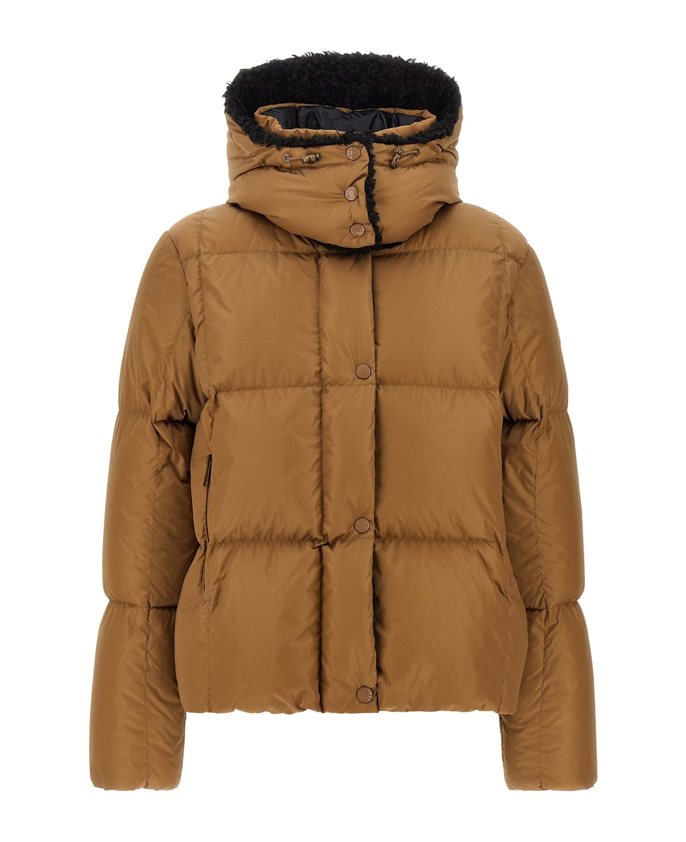 'Castelnou' short water-repellent satin finish nylon down jacket with geometric quilting and goose down padding, adjustable and removable hood with teddy-effect fleece lining, high neck, zip closure and front snap buttons, pockets, long sleeves with elastic cuffs and felt logo patch.