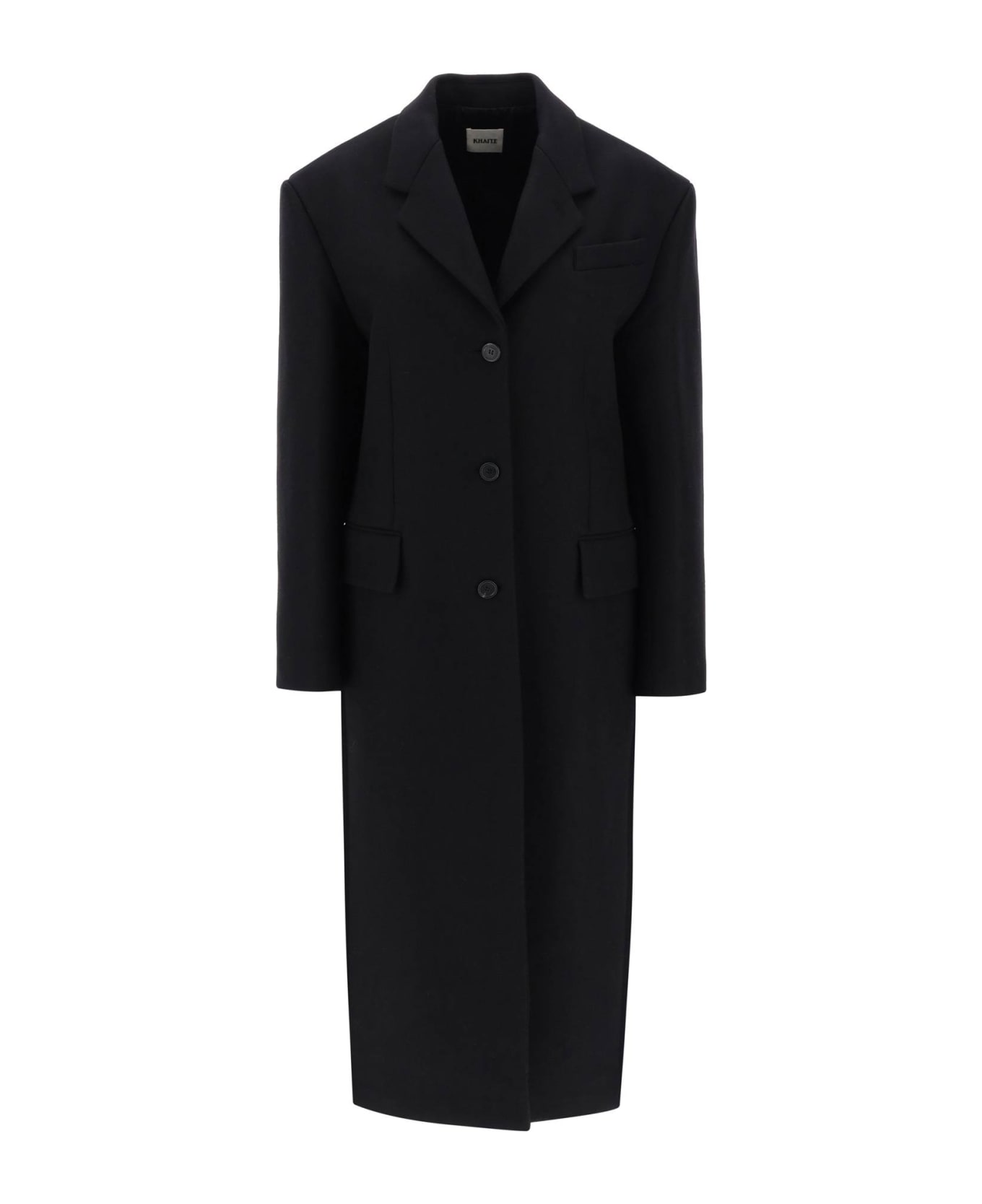 Maxi coat by Khaite crafted in virgin wool-blend melton with single-breasted design. It features notch lapel, a welt pocket on the chest, jetted pockets with flap and back-center vent. Lined in cupro and provided with internal pockets. Oversized fit with slightly padded shoulders and shaped cut at the waist. The model is 177 cm tall and wears size S.