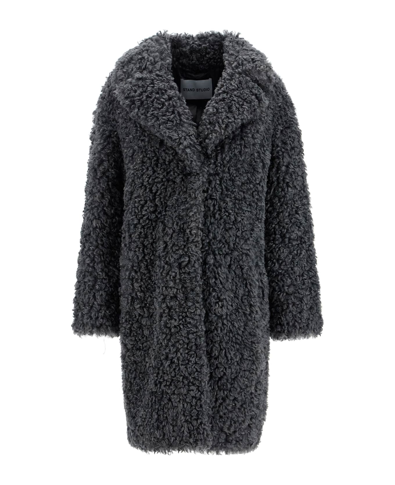 Stand Studio single-breasted coat made from curled faux fur to an oversized, cocoon silhouette with knee length, featuring a hidden snap fastening and wide lapels. It is finished with two hand pockets and an inside pocket. Full lining. The model is 177 cm tall and wears a size EU 34.