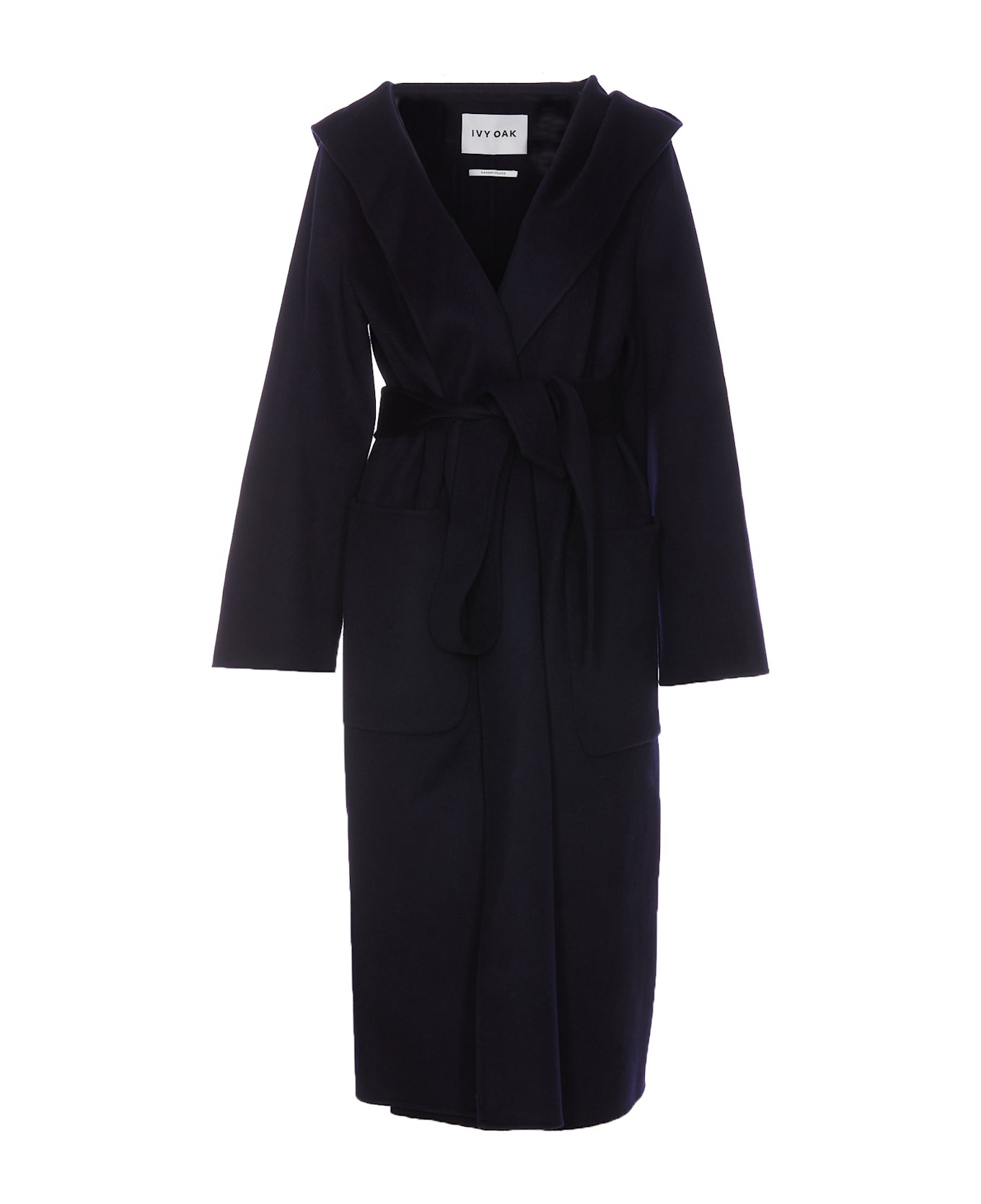 Ivy & Oak navy blue Celie Edie coat with belt closure on waist, long sleeves, frontal pockets, hood detail, long model
