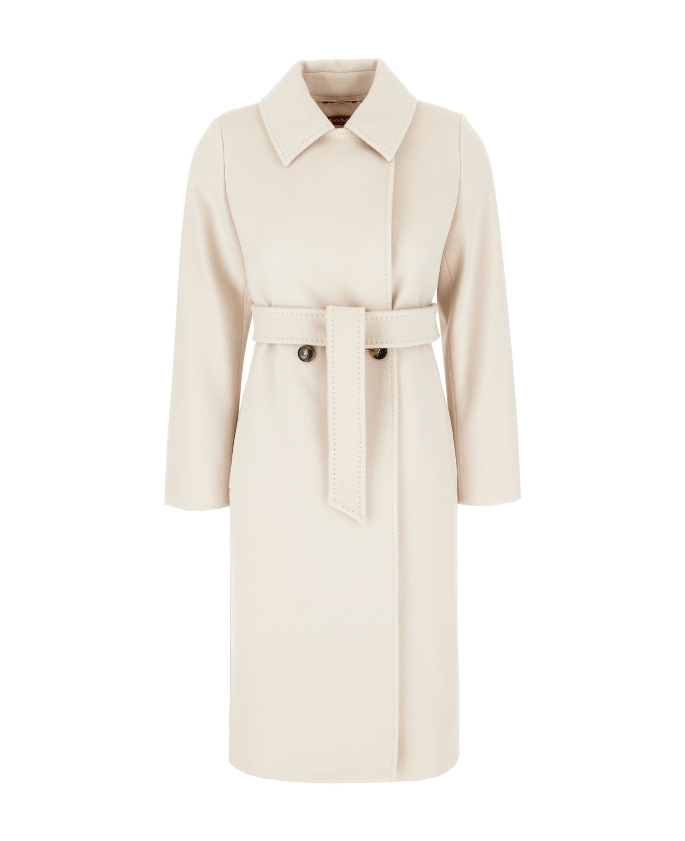 Coat realized in pure virgin wool characterized by double-breasted closure by buttons and decorative buttons. -Collar -Two seam pockets at the front -Detachable tonal fabric belt -Central slit at the back -Lined