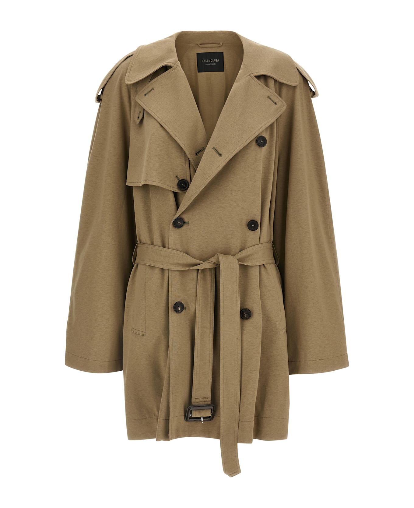 Double-breasted short mélange light cotton trench coat with front button closure, lapel collar, pockets, long sleeves, cape and back split, and removable belt. Composition: 100% cotton