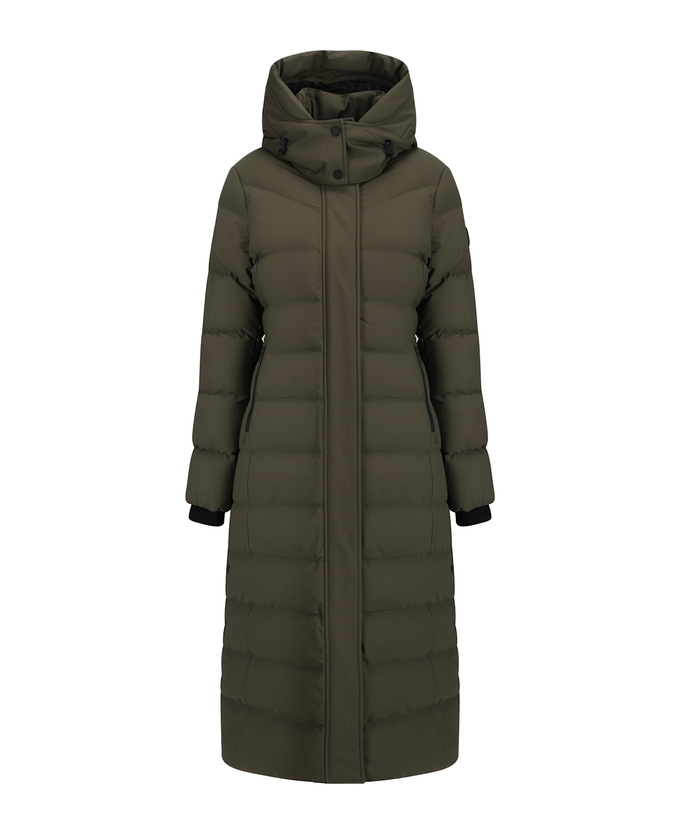 Jocanda down jacket by moose knuckles, long model with button-removable and drawstring-adjustable hood, front snap closure, two zippered side welt pockets, all-over quilted and padded design, elastic ribbed cuffs, two adjustable side slits with buttons, regular fit, patch with iconic brand monogram applied on left arm.
