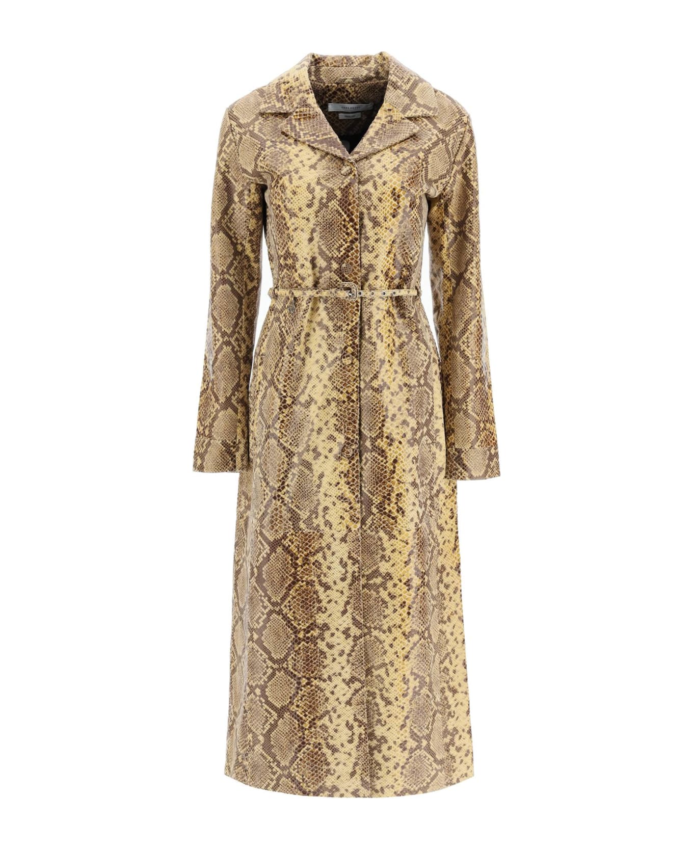 Lea long coat by Saks Potts crafted in snake-print leather with classic lapel collar and front closure with leather-covered press-stud buttons. Straight silhouette with defined waist thanks to the thin matching belt with leather-covered buckle. Front inseam pockets and rear middle vent. Micro logo detail in silver-tone metal applied on the front waistline. Jacquard fabric lining and one inner welt pocket. The model is 177 cm tall and wears size XS.