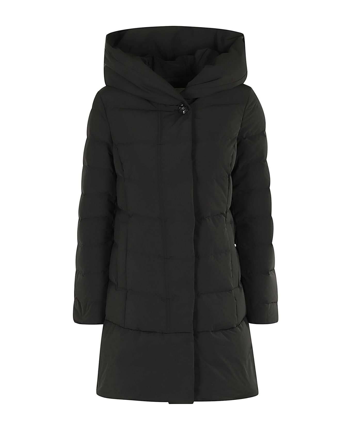 Coat - Woolrich - Black color - Puffy prescott pattern - Hood - Long sleeves - Two wire front pockets with snap button - Front zipper and snap button closure