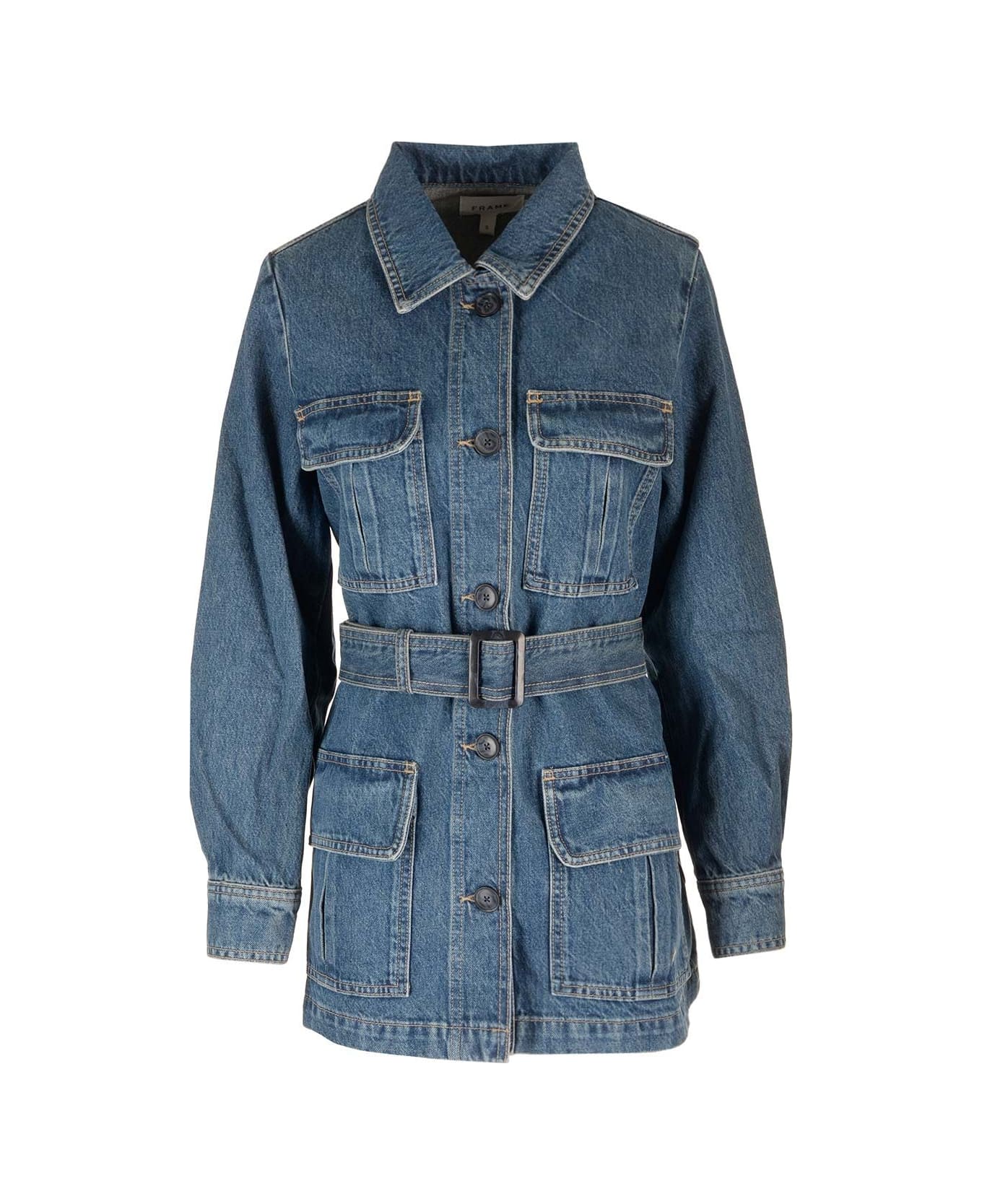 Blue denim safari jacket from Frame with regular fit, front buttons, classic collar, matching belt.
