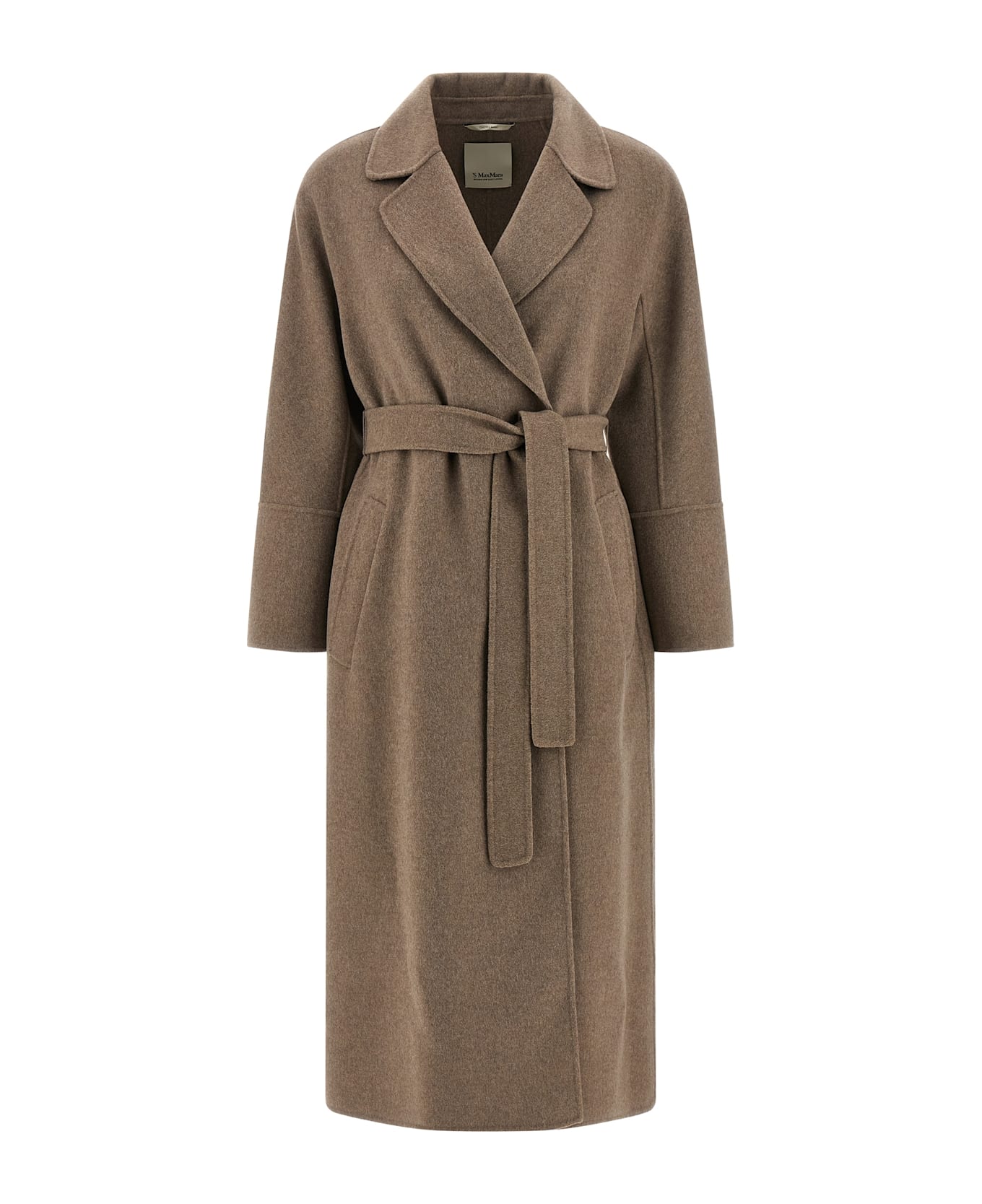 Long 'SmmElisa' coat in double drap of pure wool sewn by hand, dressing gown style with slightly flared line, lapel collar, long kimono sleeves with cuffs, pockets, unlined, removable belt. Composition: 100% virgin wool
