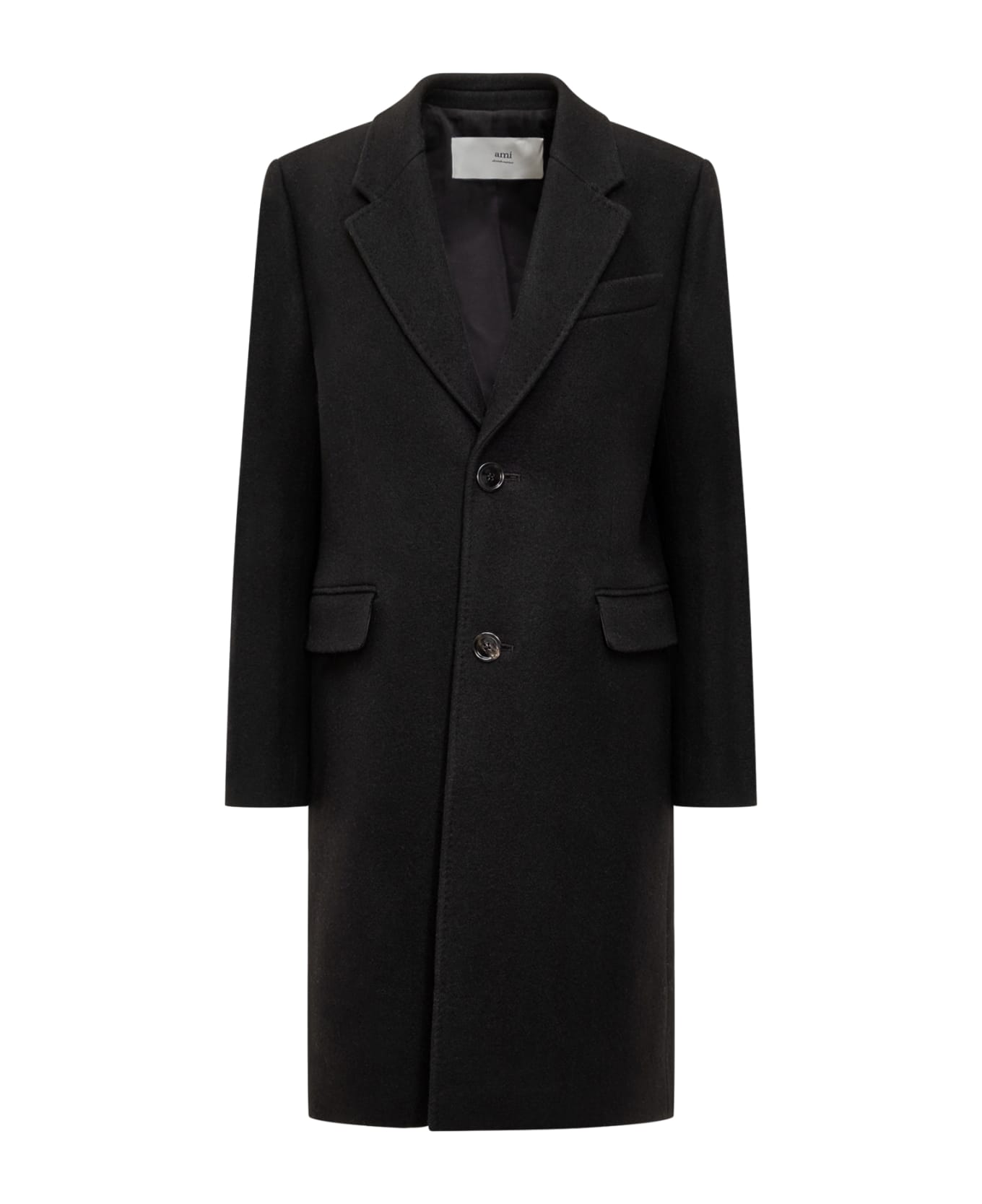 Black long coat. Two-button closure. Lapel collar. Flap pockets. Breast pocket. Buttons on cuffs. Back slit. Composition: Outside: 100% Virgin Wool Lining: 50% Cotton, 50% Polyester
