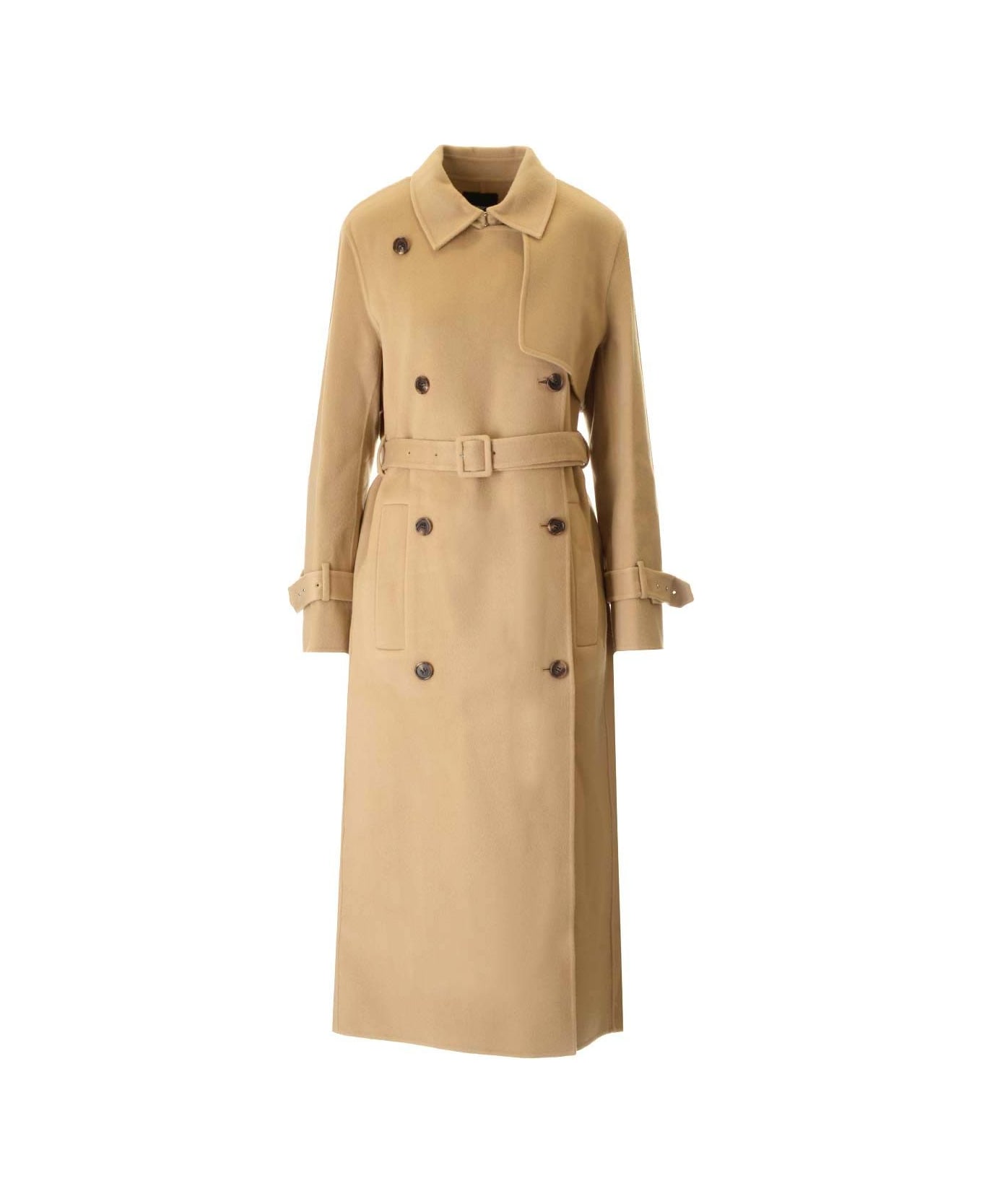 Long wool coat by Theory, button fastening and fabric belt, collar and two side slit pockets.