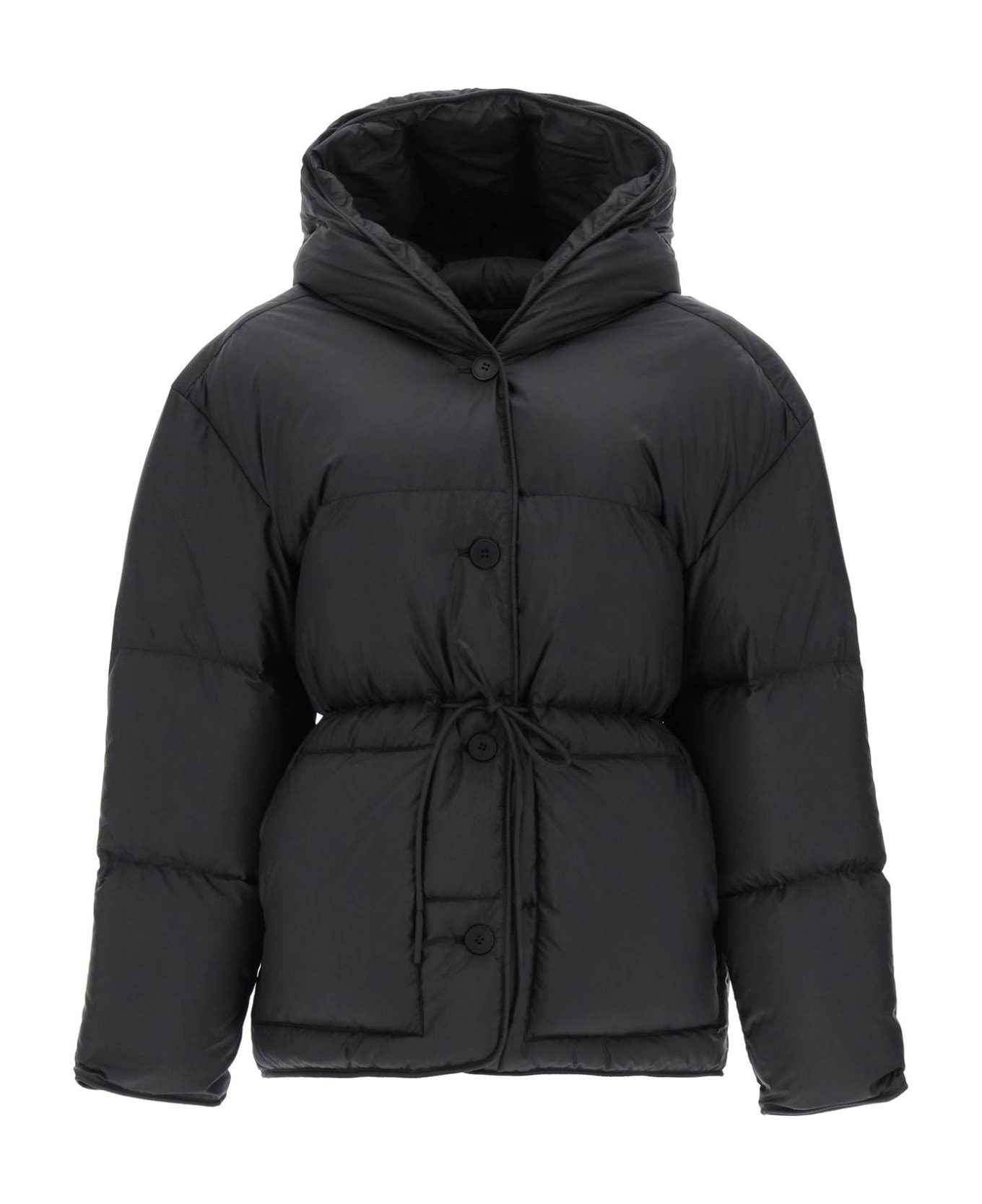 Puffer jacket by Ienki Ienki made of quilted matte-finish nylon ripstop with goose down padding. Design characterized by an oversized fit adjustable with inner drawstring at waist featuring a fixed hood, front button closure and patch pockets. Lined interior. The model is 177 cm tall and wears a size XS.