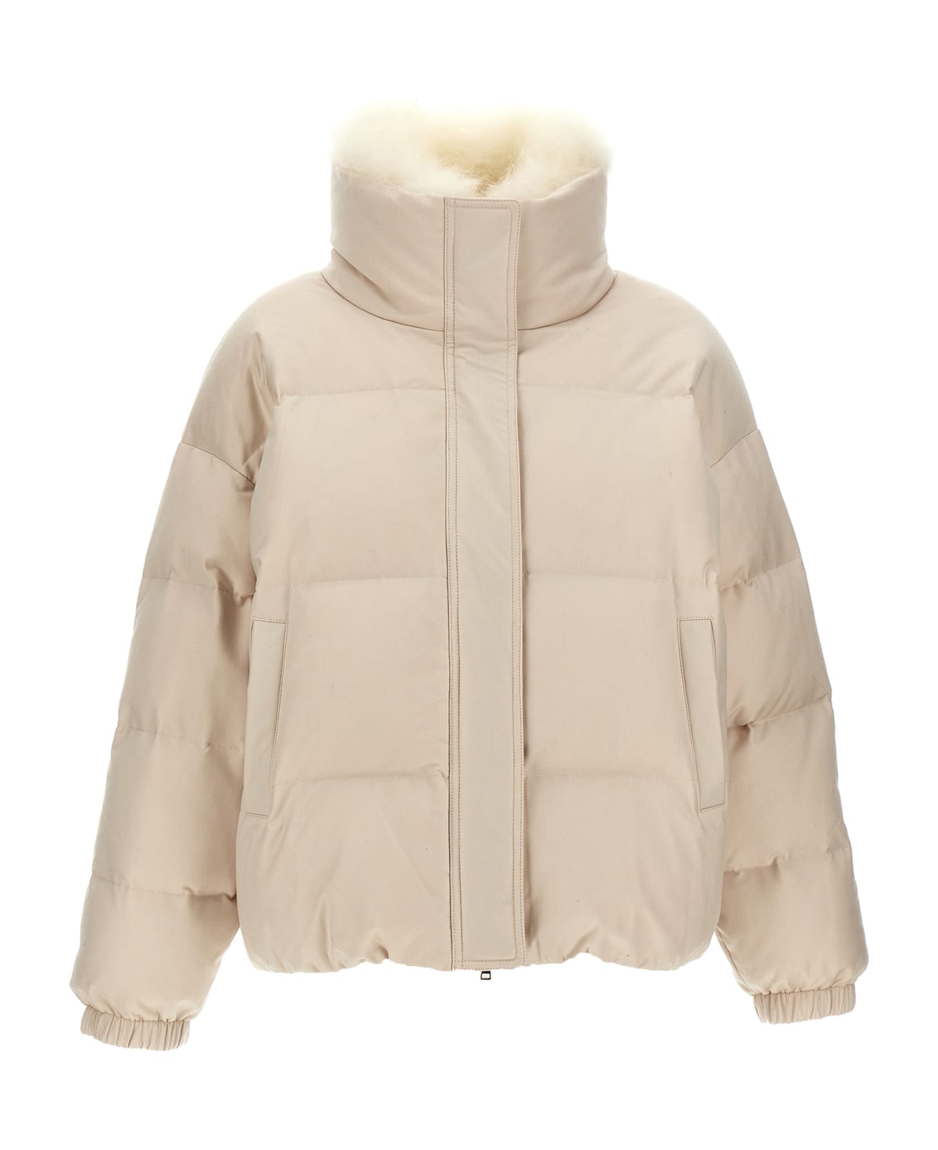 'Doudoune' wool and silk down jacket with duck feather padding, lamb hair inserts, zip and button closure, belt at the waist, pockets, long sleeves with elastic cuffs, removable matching gloves.