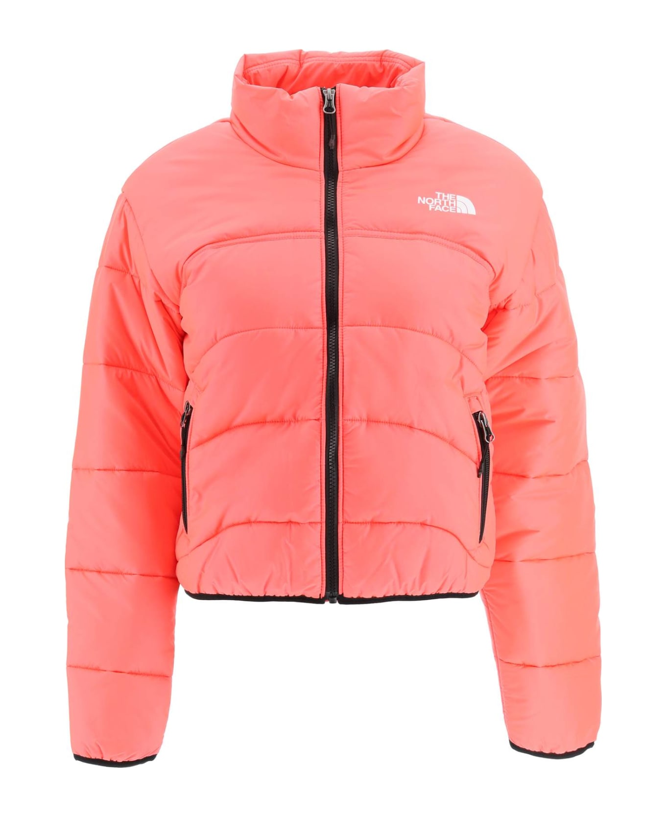 The North Face short quilted jacket in water-repellent and windproof ripstop fabric, filled with synthetic wadding. It features a stand collar, zip fastening, zip pockets and elasticated cuffs and hem. Logo printed on the yokes. This garment is entirely made with recycled fabrics. The model is 177 cm tall and wears a size XS.