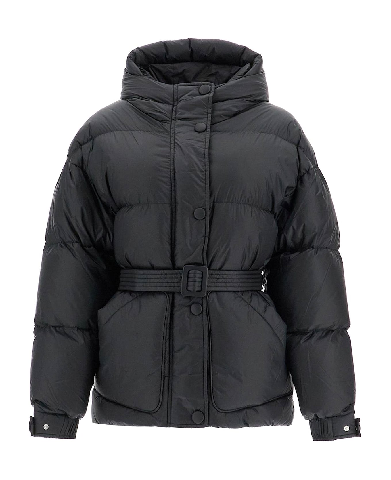 Oversized jacket by Ienki Ienki made of quilted matte-finish nylon with goose down padding, cinched at the waist with a matching belt. It features a fixed hood, concealed two-way zip and snap fastening, adjustable cuffs, external patch pockets and two internal pockets. Cotton lining. The model is 177 cm tall and wears a size XS.