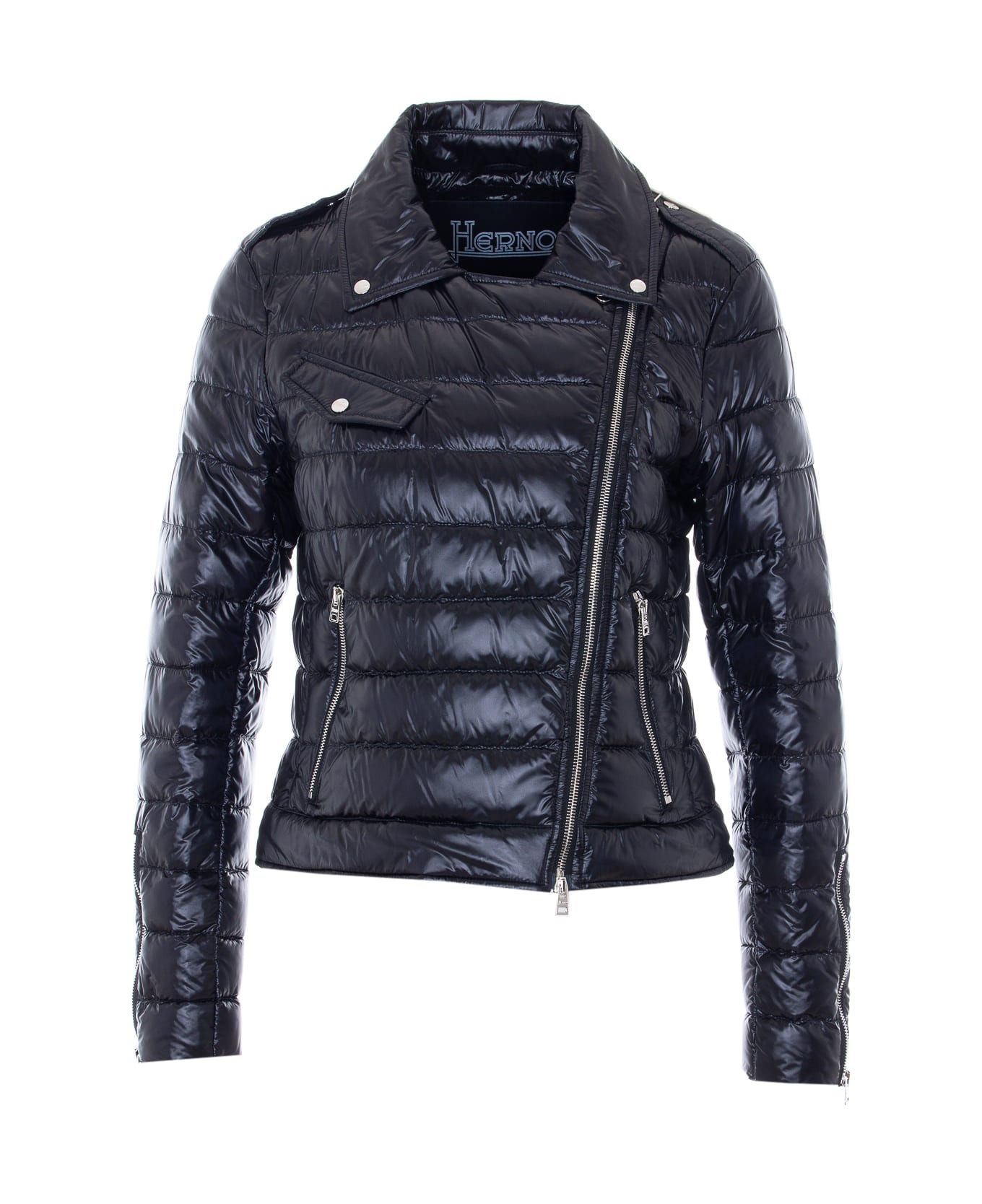 Herno black down jacket, double zip closure, glossy effect, biker model, padded Composition: 100% Polyamide, 100% Goose Down