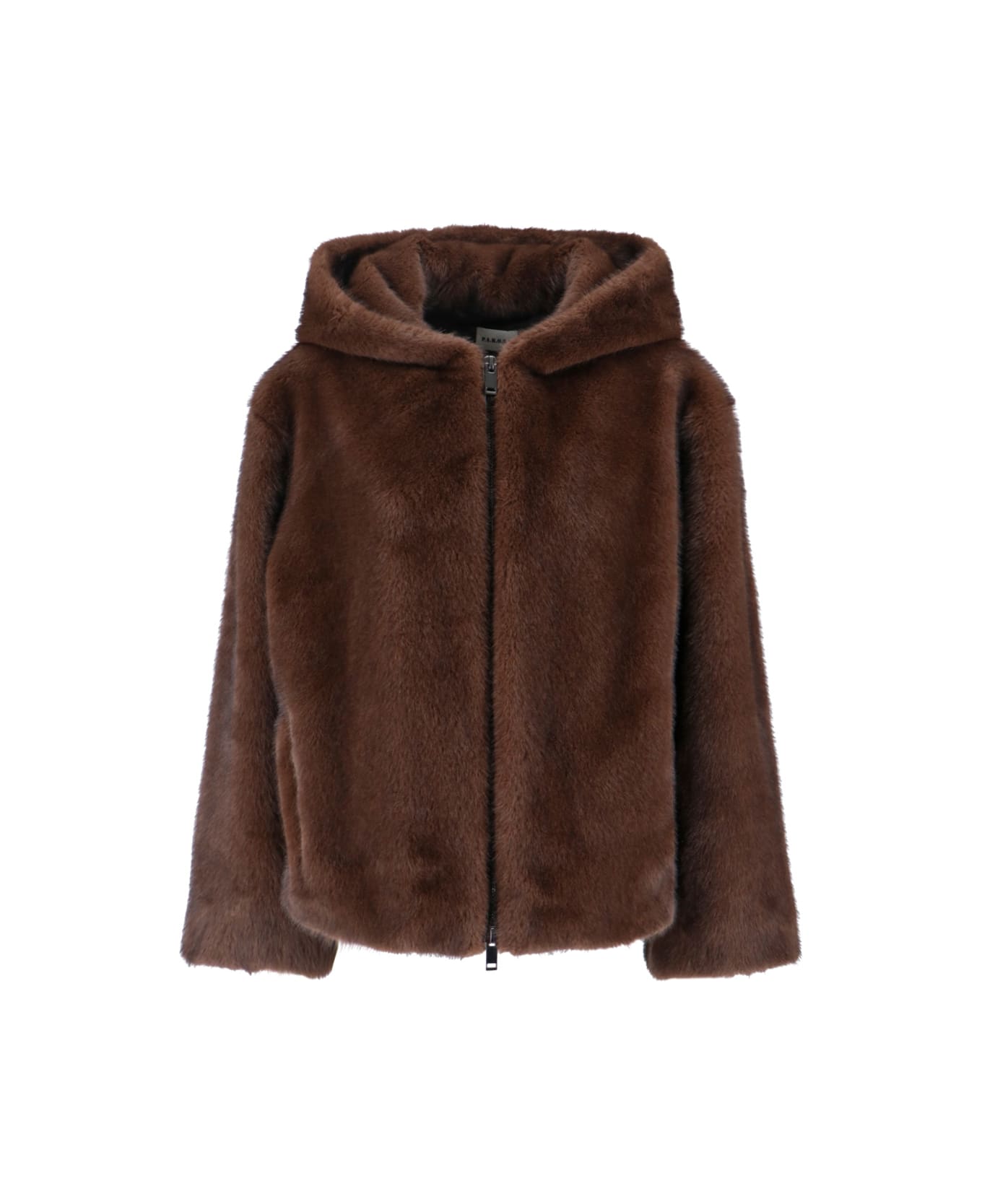 P. A. R. O. S. H brown faux fur jacket with hood, double closure, zip, dropped shoulders, two side pockets, straight hem.