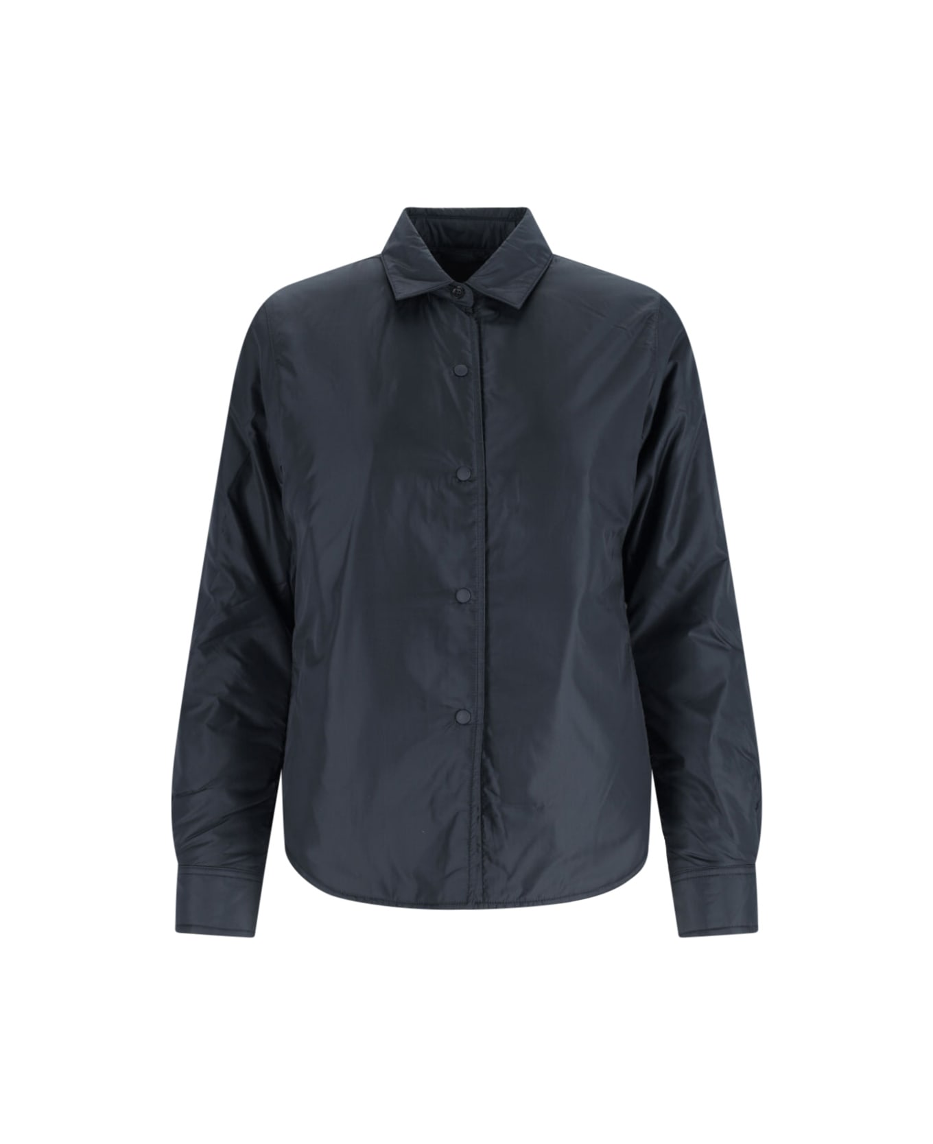 Aspesi 'Glue' shirt jacket in navy blue fabric with classic collar, button closure, button cuffs, two side pockets, logo label detail, curved hem.
