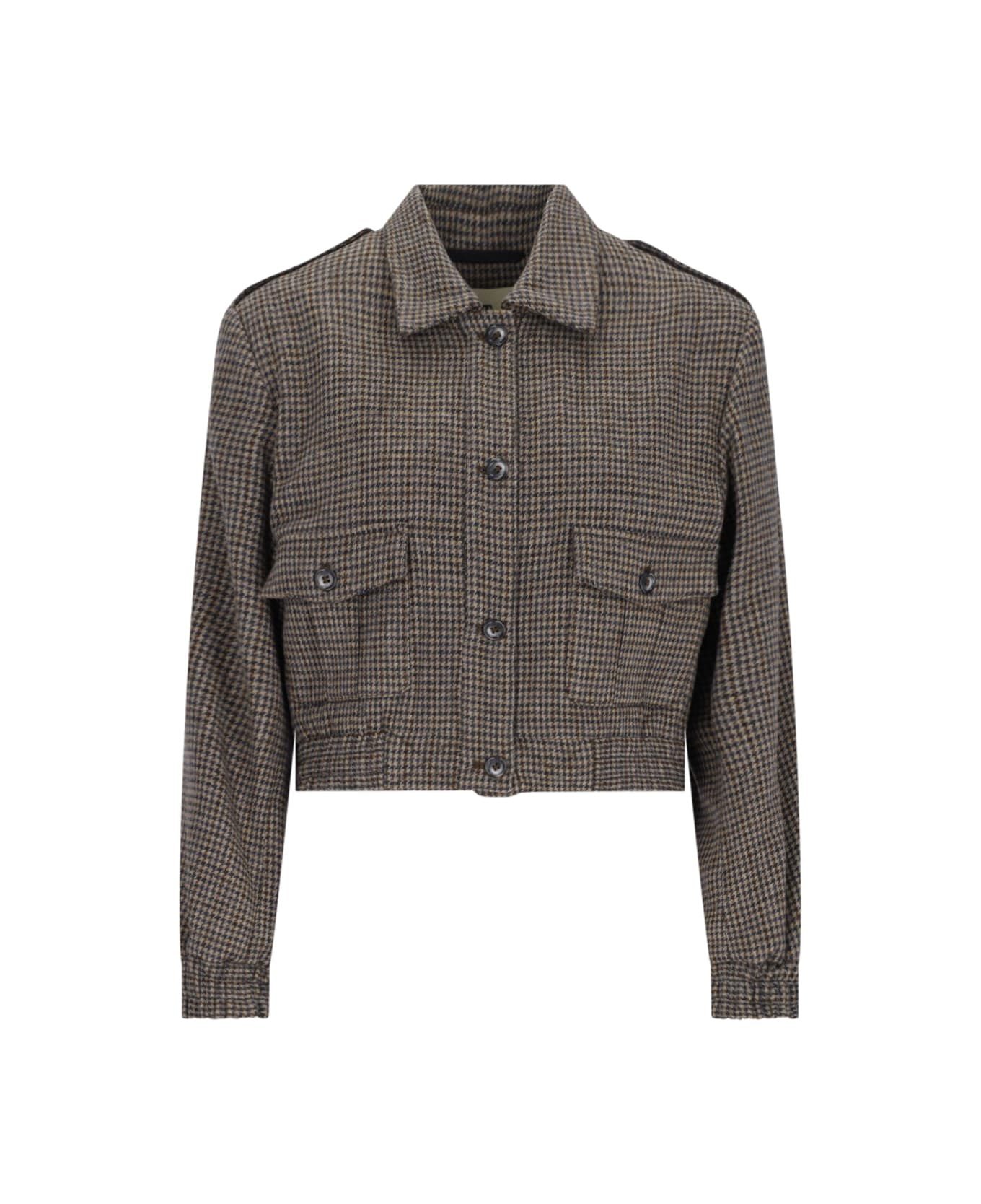 The Garment houndstooth jacket in brown wool blend with cropped design, classic collar, button closure, two gusset patch pockets, cuffs and elastic hem.