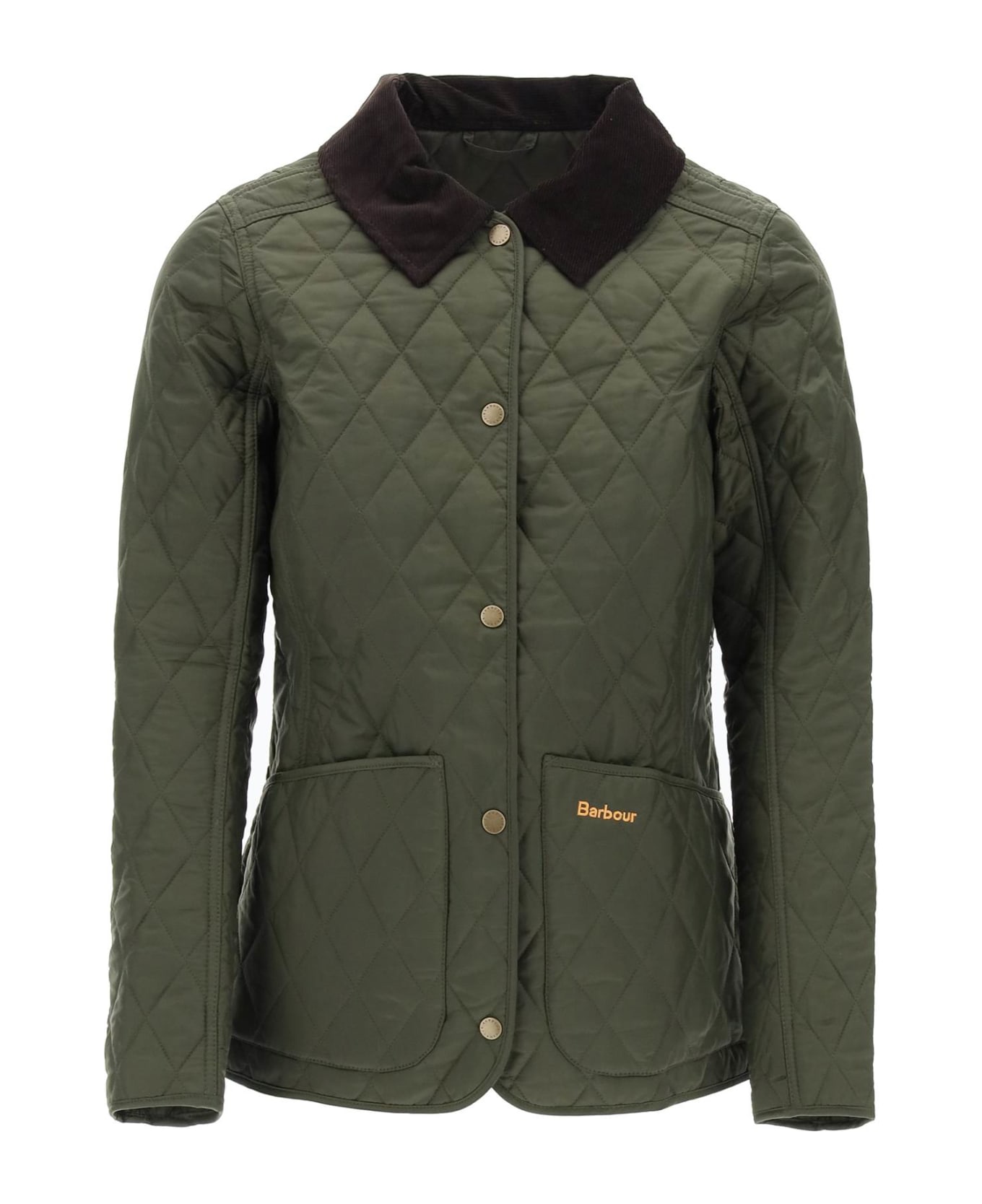 The Annandale Short Jacket by Barbour is a fitted silhouette made of diamond-quilted nylon with a lightweight polyester padding. It features a classic corduroy collar and branded snap button closure, as well as large patch pockets finished with a contrasting logo embroidery. The jacket also has an inner pocket. The model is 177 cm tall and wears a size UK 8.