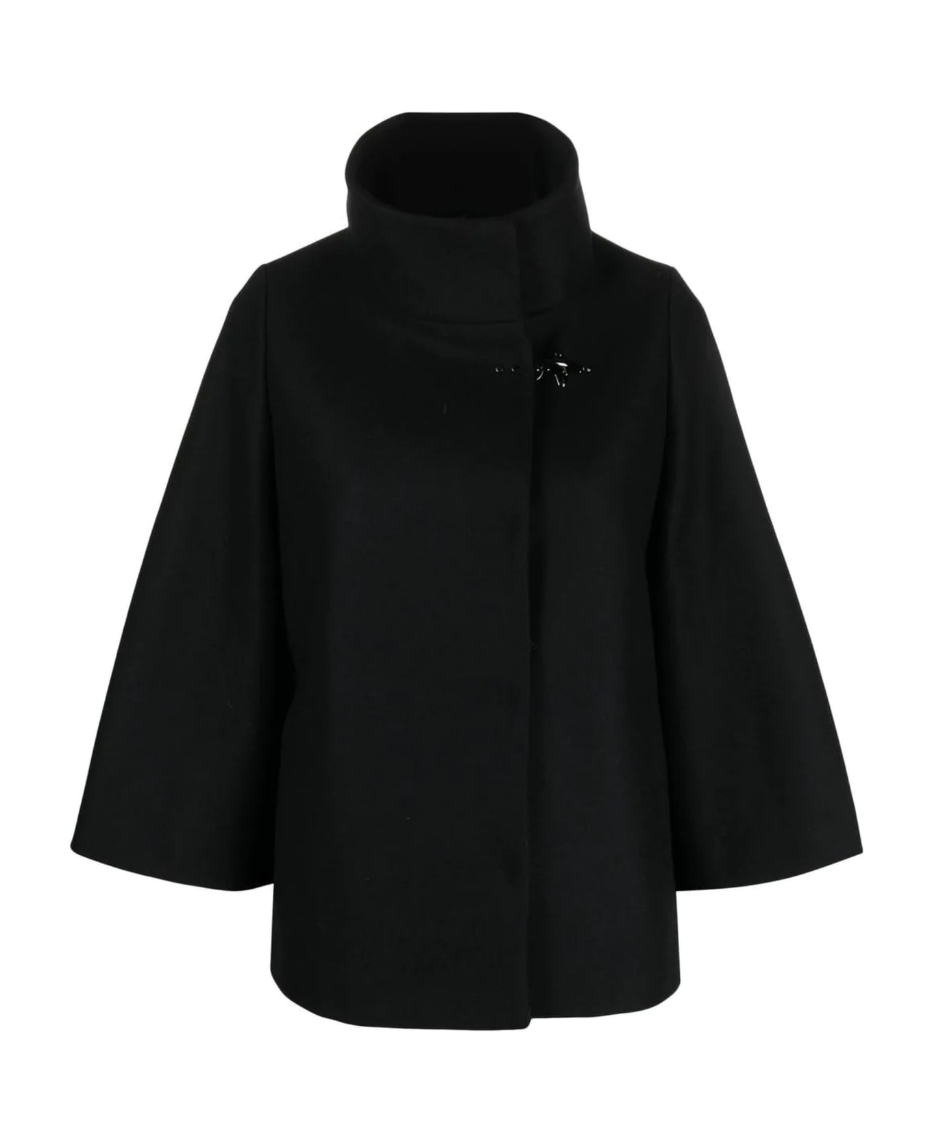 Black Black Wool-blend Fabric Cape from Fay Black wool-blend fabric cape, it comes with three-quarter length sleeves, a high collar, welt pockets and concealed snap fastening.