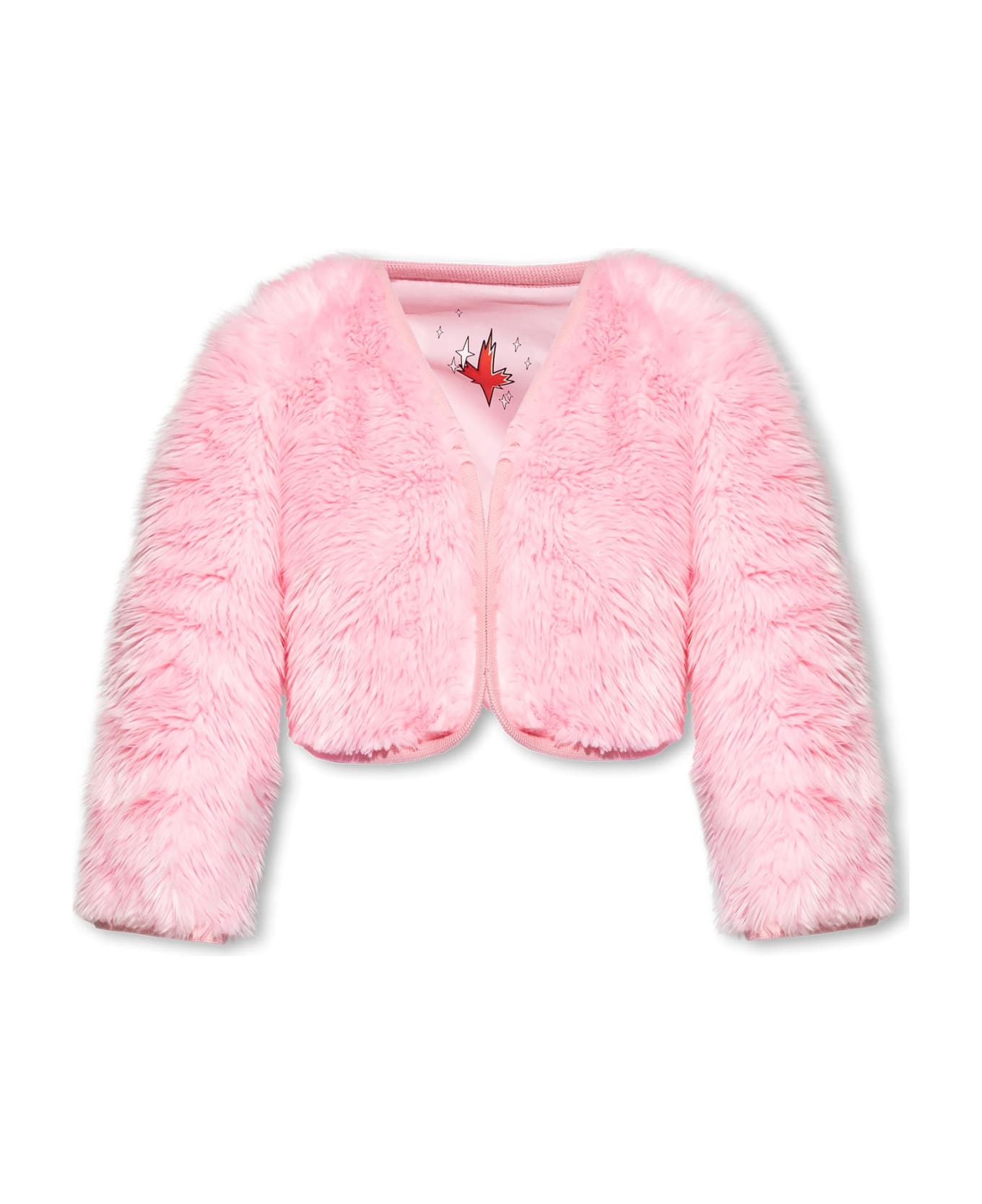 Pink cropped jacket from Dsquared2. Made of faux fur, this garment is complete with snap fastenings, a logo patch at the back, long sleeves and cotton lining with a multicolored print.