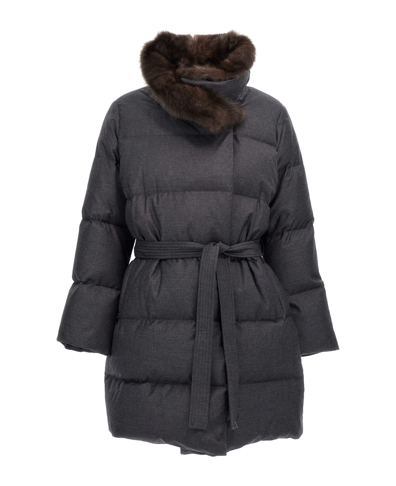 Long 'Doudoune' wool and silk down jacket with duck feather padding, sable fur inserts, zip and button closure, belt at the waist, pockets, long sleeves, removable matching gloves.