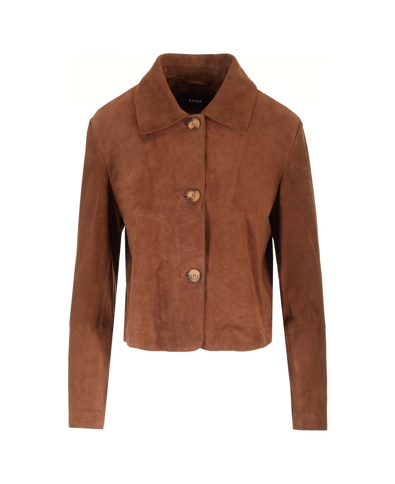 "Emy" jacket in burnt brown suede leather from Arma with pointed collar, exposed buttons, low slit pockets.
