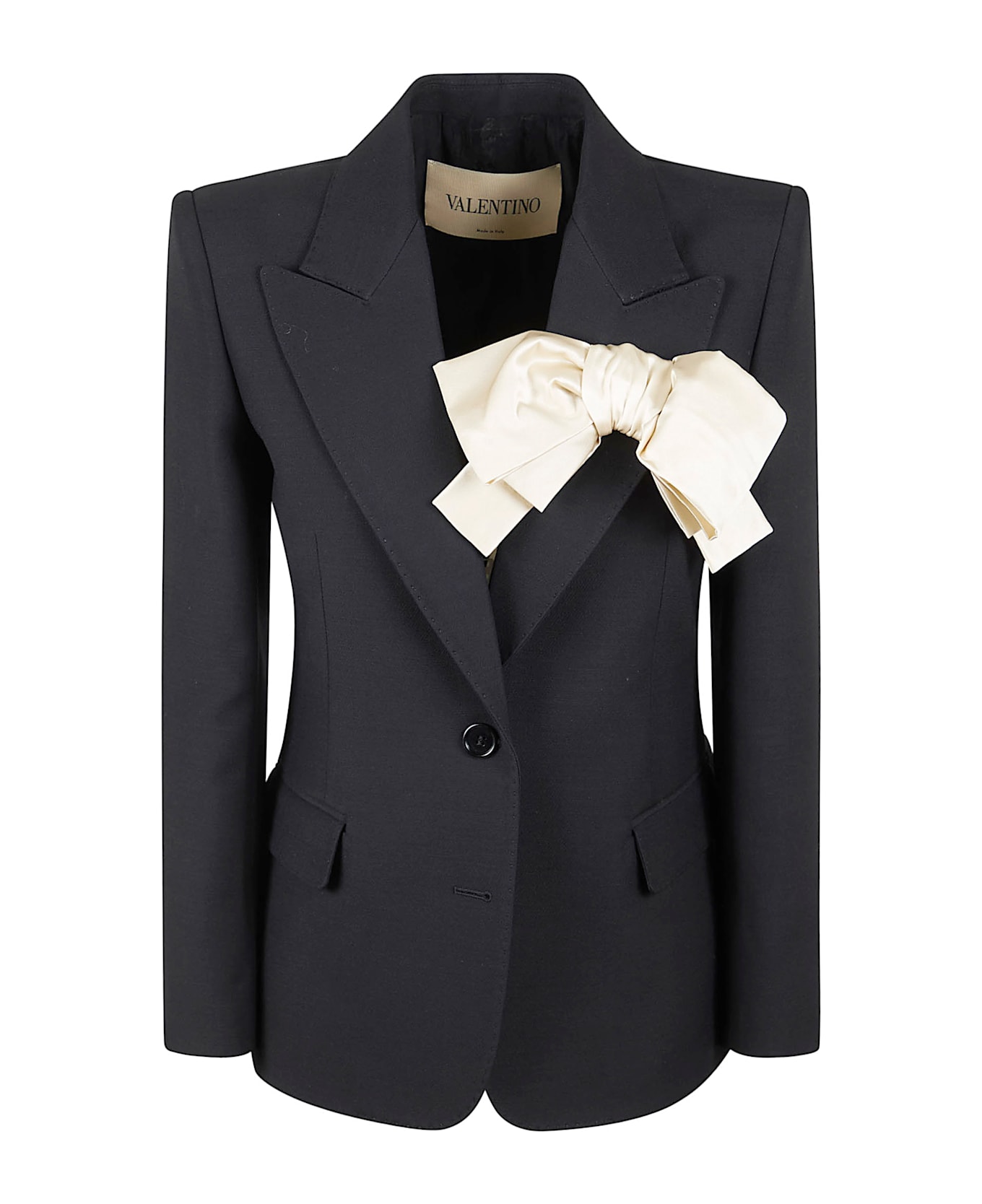 Crepe Couture jacket by VALENTINO GARAVANI. Front button closure; two flap pockets; padded shoulders. Features a crepe satin bow.