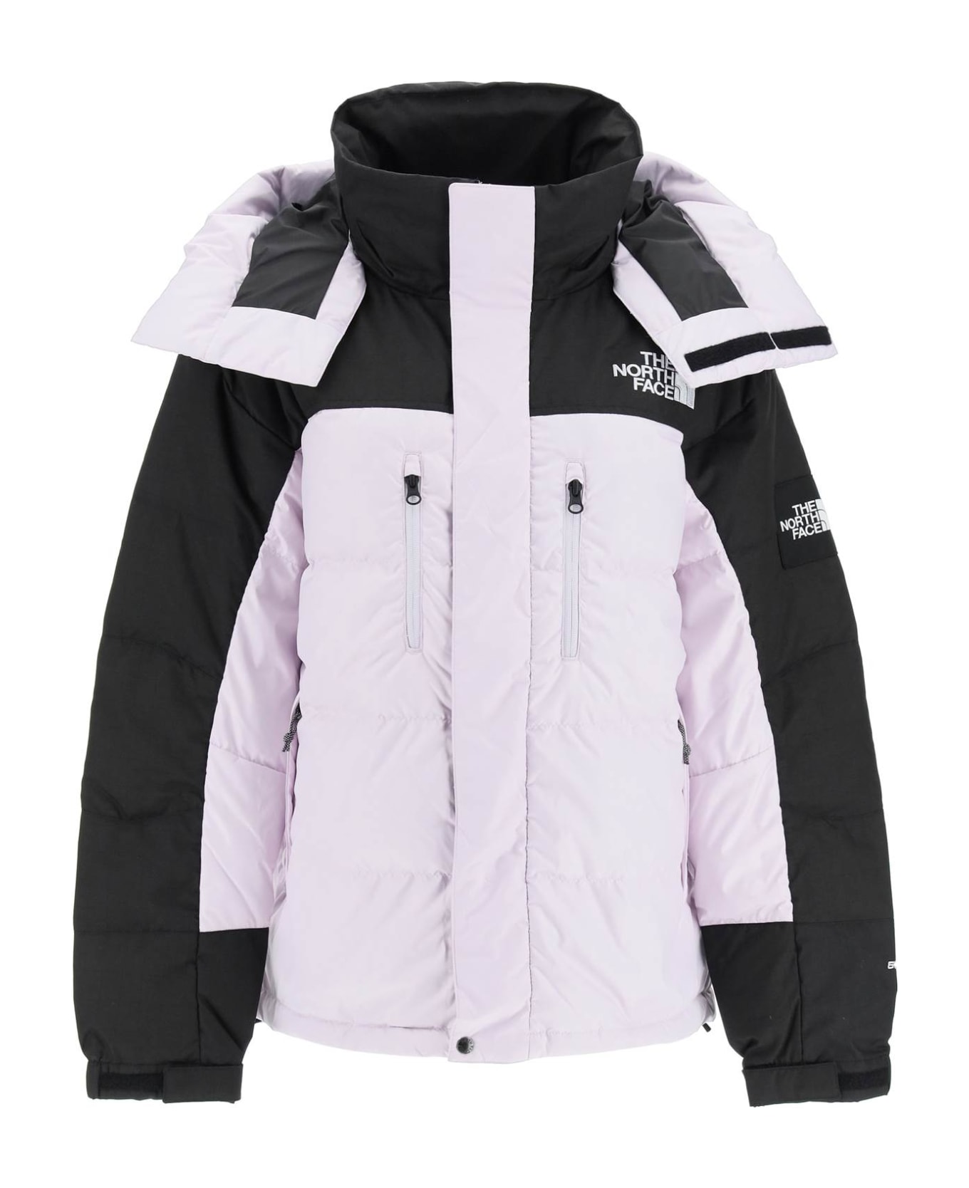 The North Face short down jacket in windproof two-tone ripstop nylon, quilted and padded with 550 RDS down. It features a hidden zip and velcro fastening, adjustable detachable hood, four zippered welt pockets at front, elasticated cuffs with adjustable velcro tabs and elastic drawstring at the hem. Embroidered logo at the chest and back. Nylon-lined interior hosting two pockets. The model is 177 cm tall and wears a size M.