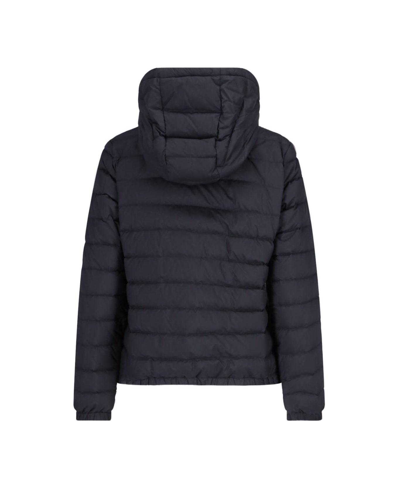 Moncler logo zip down 'hede' jacket in navy blue nylon with quilted and padded design, hood, double zip closure, two flat front button pockets, multicolor logo patch on the sleeve, elasticated details on the hem, straight hem.