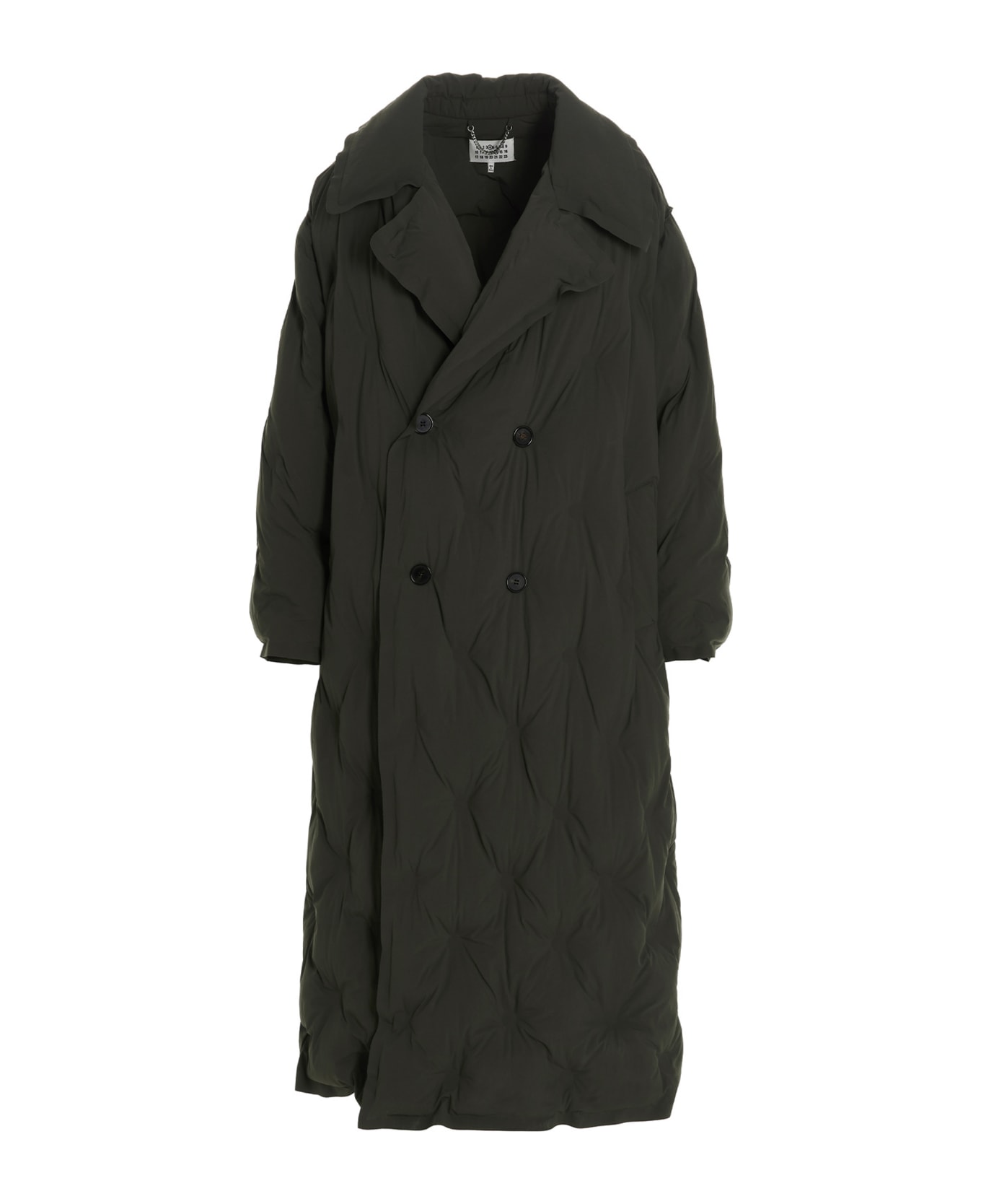 Double-breasted long down jacket with button closure, pockets, long sleeves, collar and V-neck.