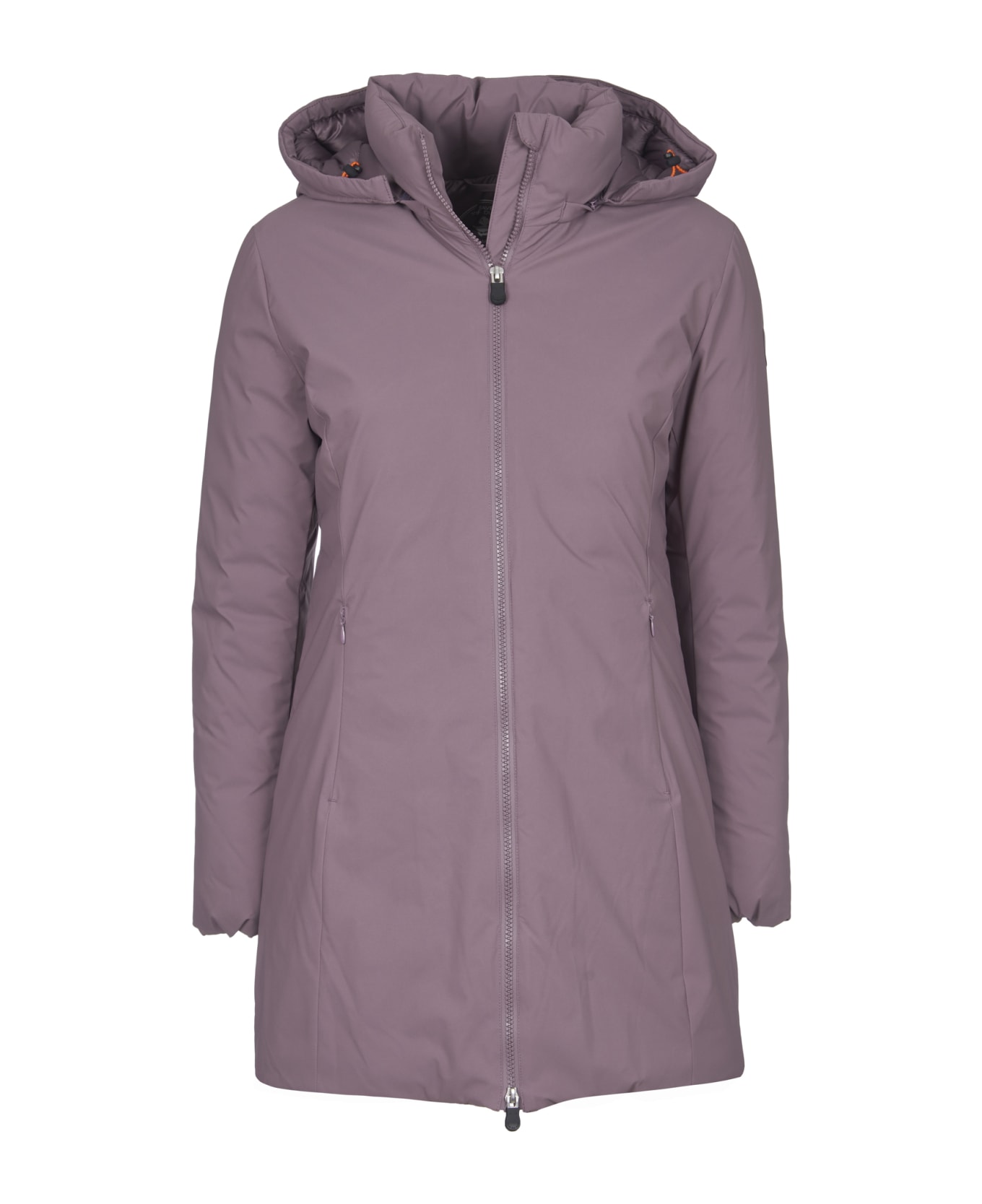 Rachel jacket in wisteria color with detachable hood. Double slider zip closure, quilted interior, side pockets with zip. Slim fit. Composition: 100% polyester, 100% recycled fibers. Made in China.