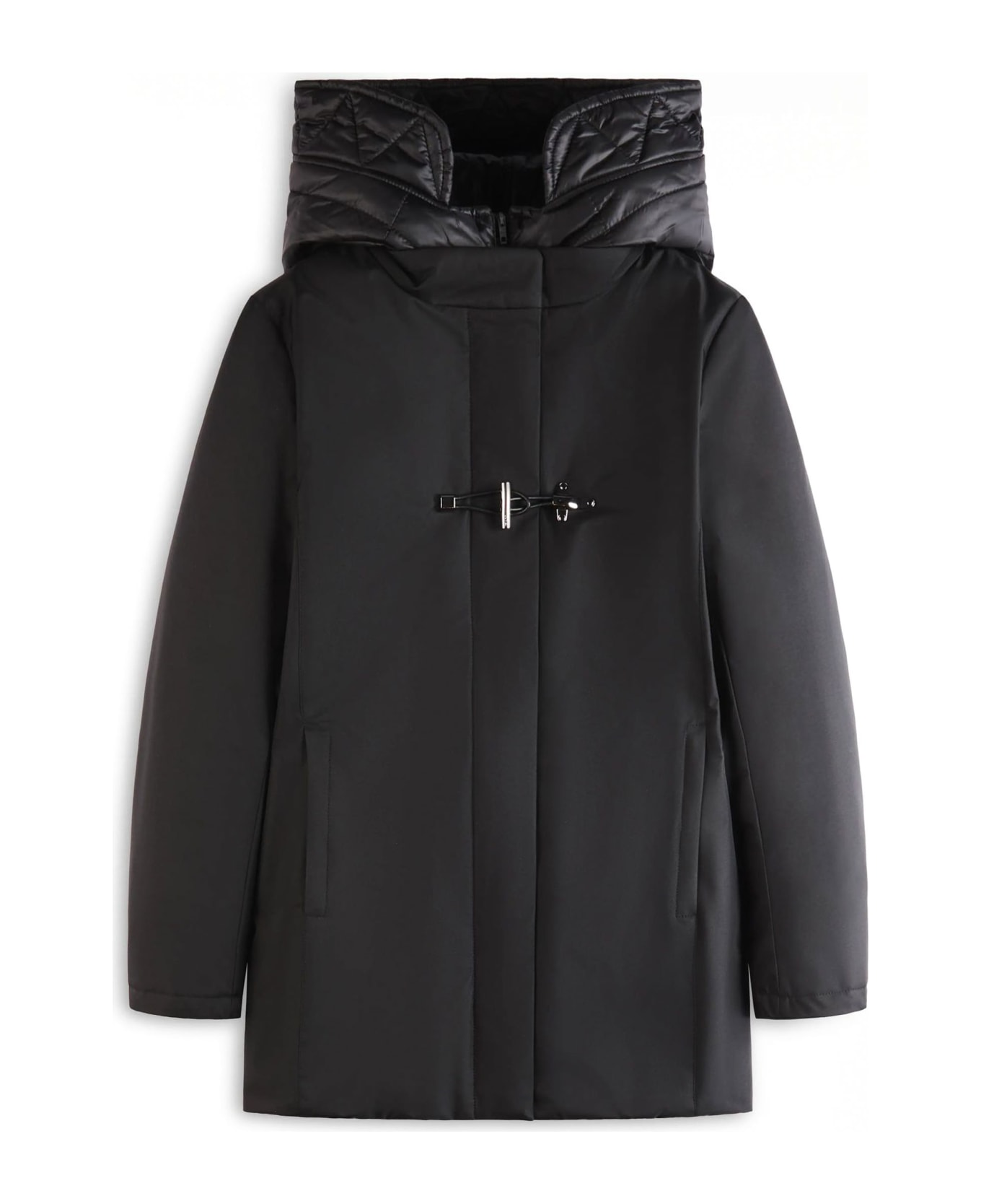 Toggle Coat in water-repellent technical gabardine, with a technical wadding padded bib and hood, it features zipped welt pockets and windproof cuffs, zip fastening, concealed snaps and Fay frog. It is characterized by an internal tag with the garment's name.