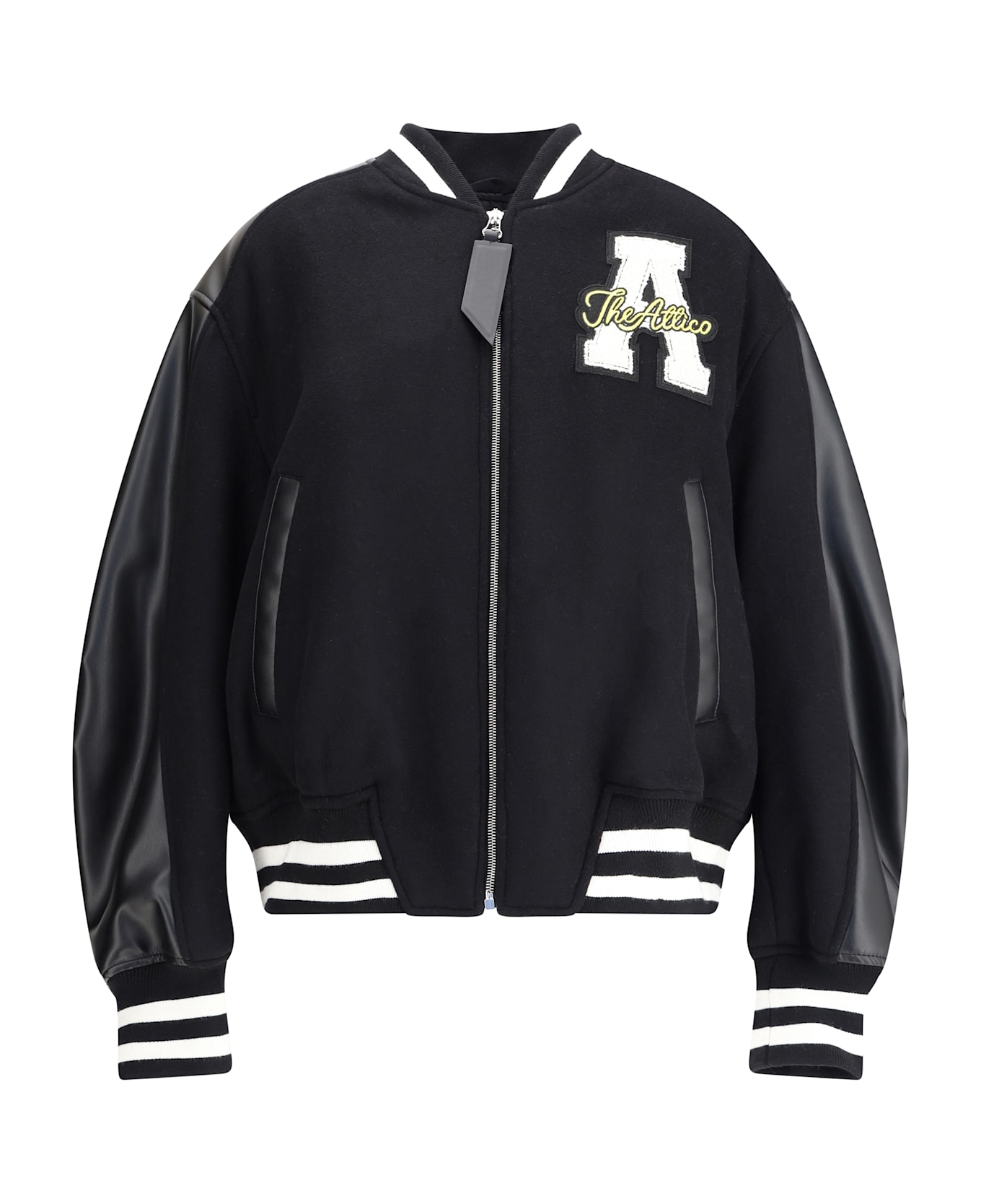 The attico's varsity bomber jacket is made of wool cloth and features a front zipper closure. ribbed collar, cuffs and hem give a sporty touch, while the two leather welt pockets add elegance. paneled sleeves and a stitched logo on the front and back complete the garment's distinctive design.