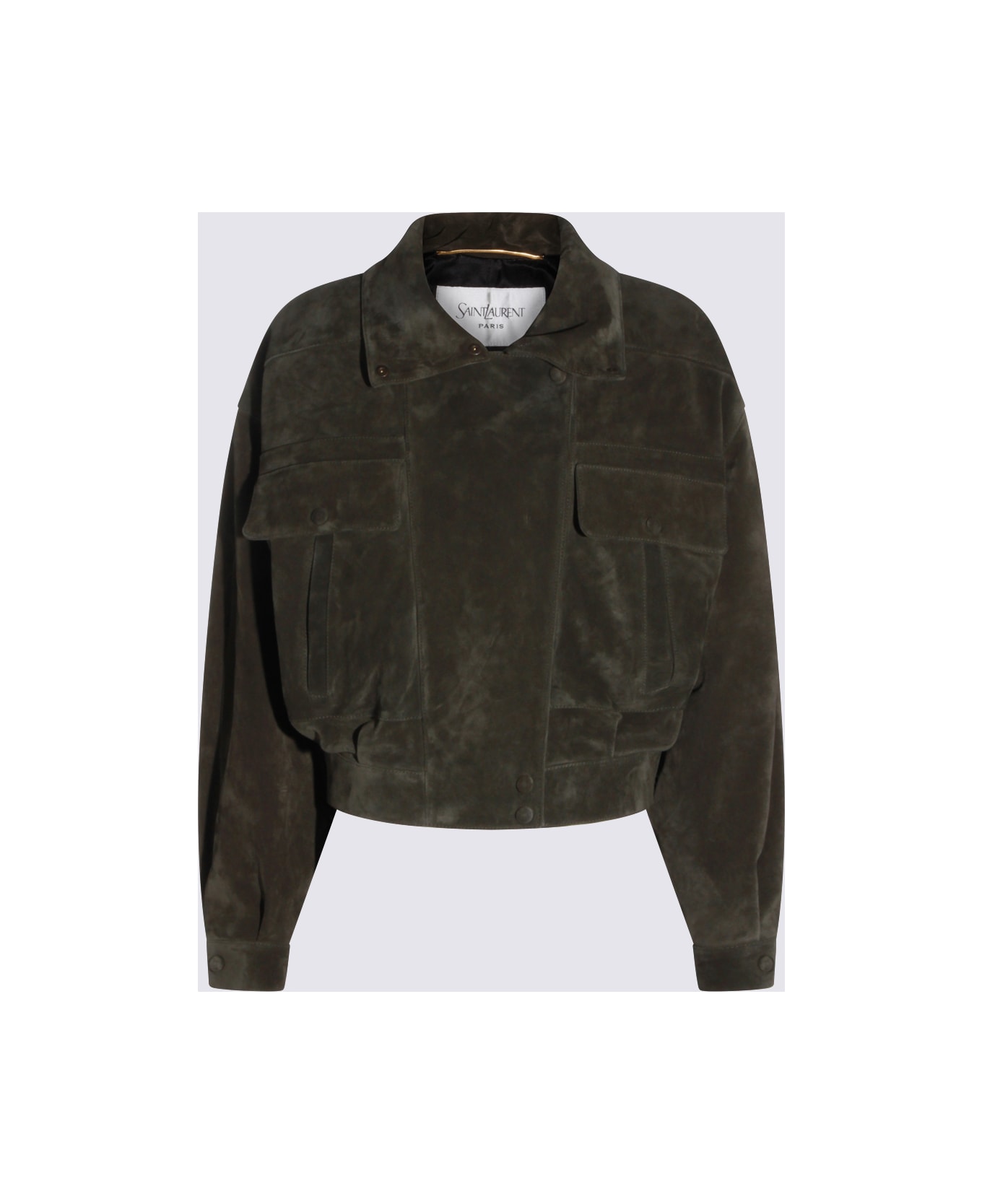 Dark green leather jacket from Saint Laurent featuring long sleeves, frontal pockets with button closure, high neck, elasticated waist, buttoned cuffs and loose fit. Composition: _, 100% Le