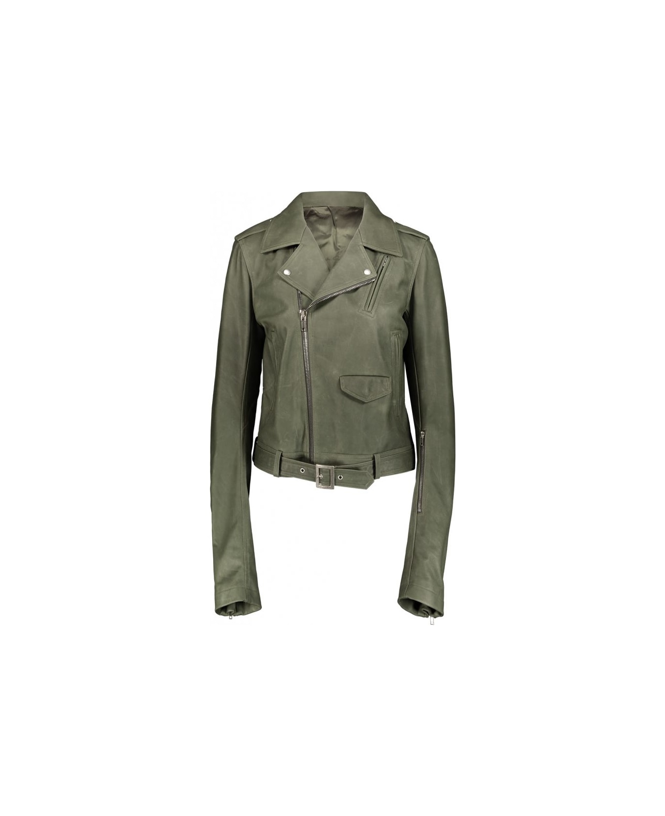 Green leather biker "lukes stooges". Hip length. Double breasted with front zipper. One sleeve and two front jet pockets with zippers, one flap pocket on the left body. Belt with metal buckle.
