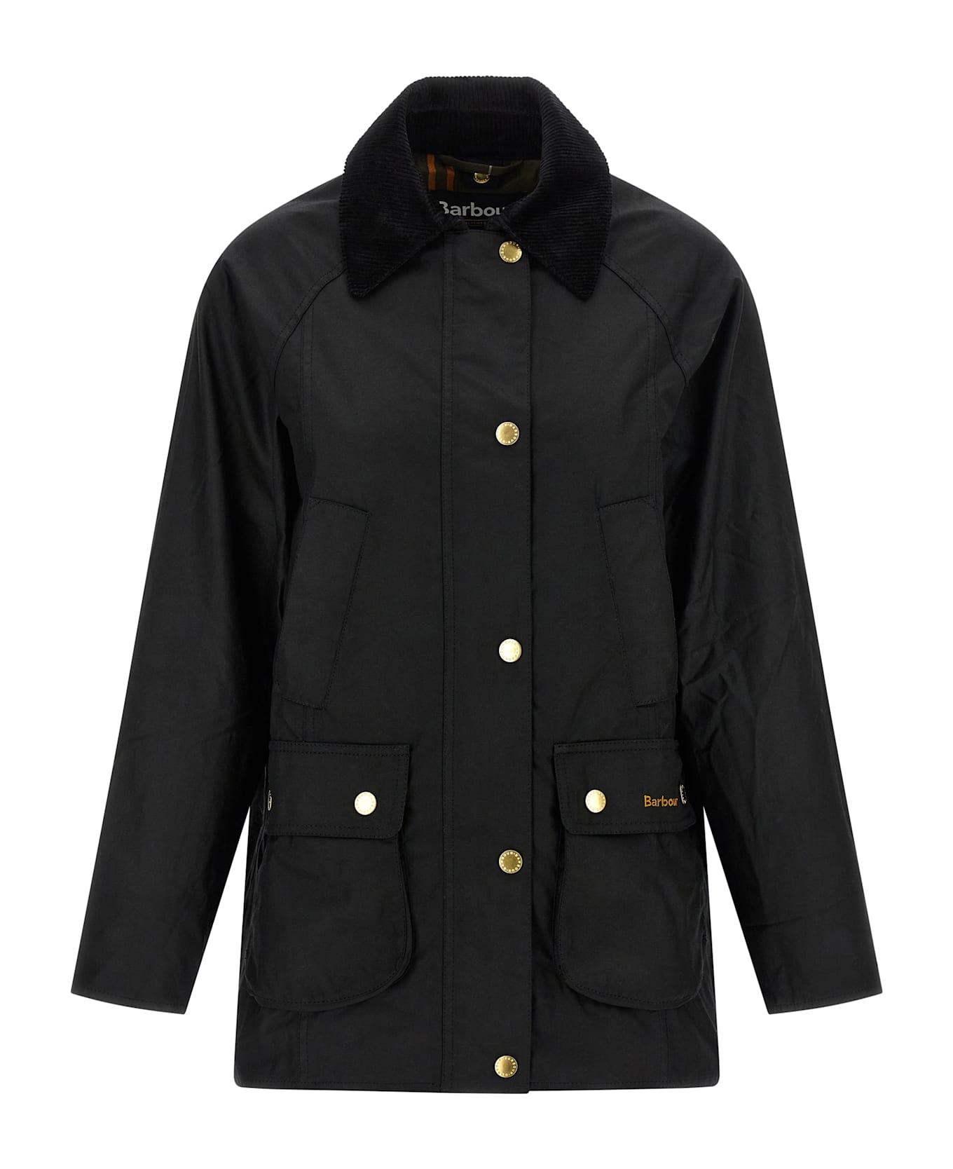 'Modern Beadnell' waxed cotton jacket, corduroy collar with removable undercollar, front logo embroidery, zip and snap button closure, pockets, long sleeves with foldable cuffs, opening back slits, check cotton lining.