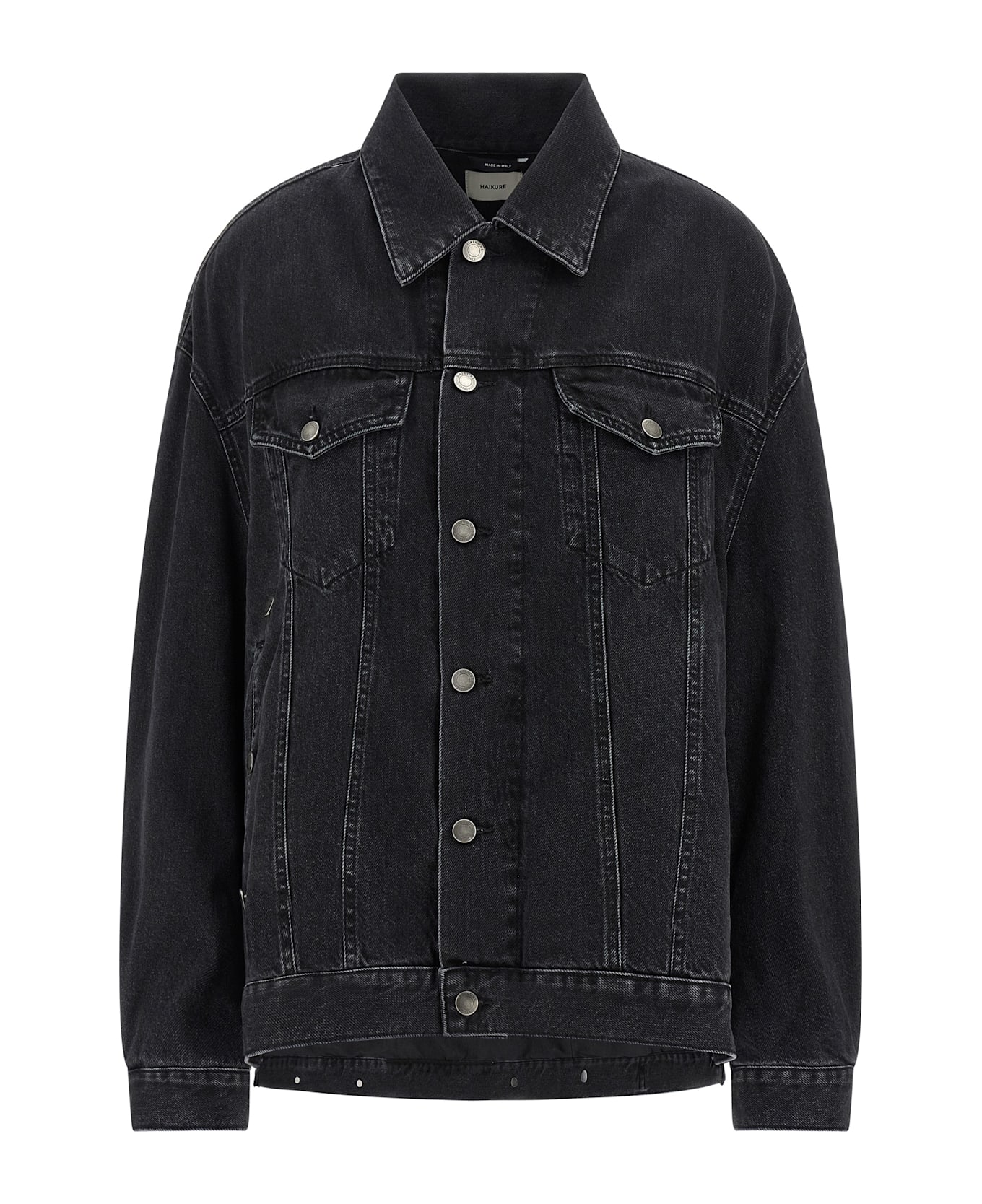 'New Janet' jacket in used-effect cotton denim with shirt collar, front button closure, pockets, long sleeves with cuffs and dropped shoulders, asymmetrical hem.