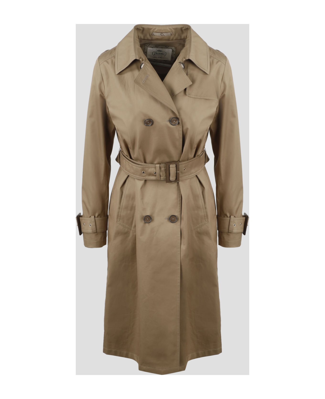 Herno trench coat in raw cotton gabardine finished with the monogram fabric. - SS23 - Slim fit - Lapel collar - Adjustable tabs at wrist - Storm flap - Double-breasted button fastening - Removable belt at the waist - Welt pockets - Pleat on the back - Made in Italy - 100%Cotton