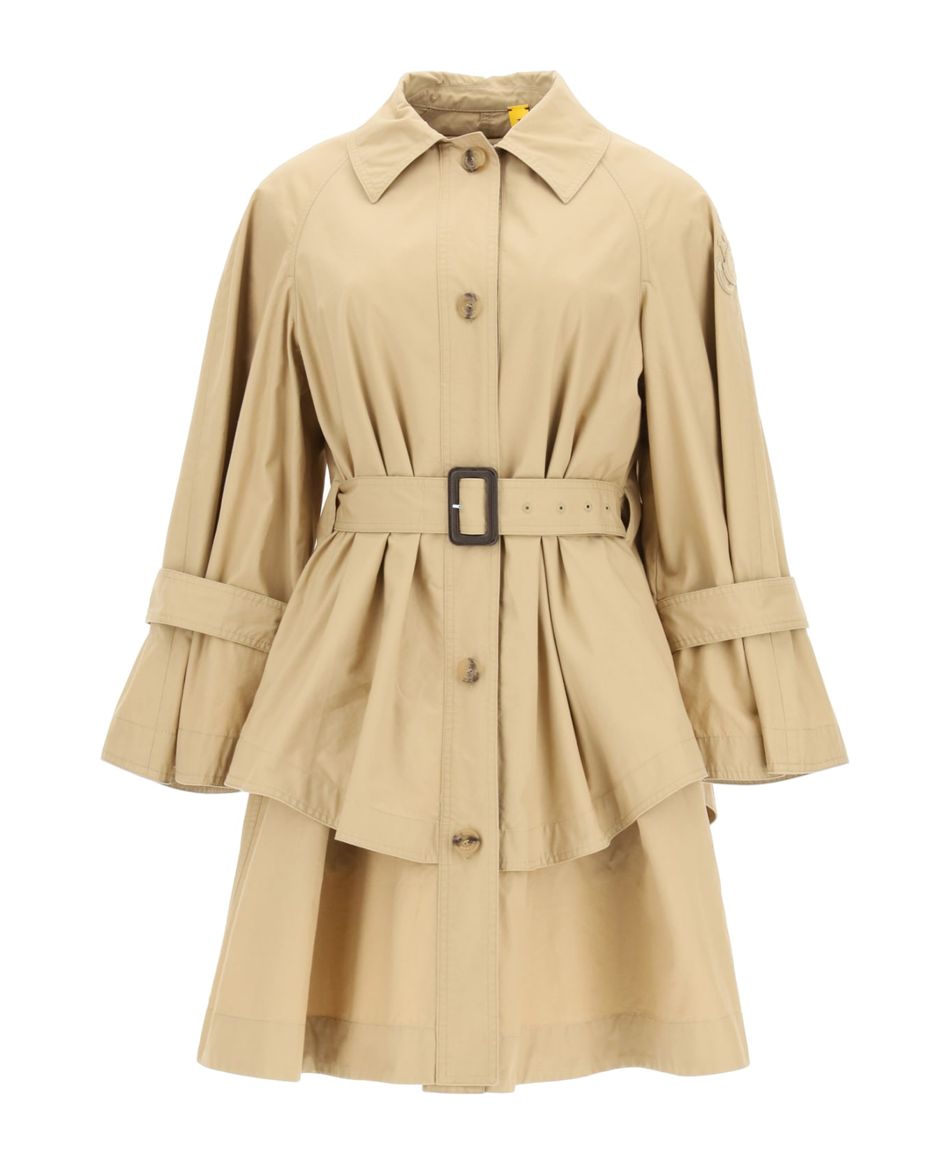 1 Moncler JW Anderson midi trench coat made from washed cotton gabardine with a trapeze cut, structured with an overlapping panel creating a double-layer design. Single-breasted closure with buttons, classic collar and side inseam pockets. Wide flared sleeves with adjustable wrist straps with buttons. Equipped with a belt with faux leather buckle visible only on the front and hidden on the back. Unlined. Felt logo patch on the sleeve. The model is 177 cm tall and wears size 0 Moncler.