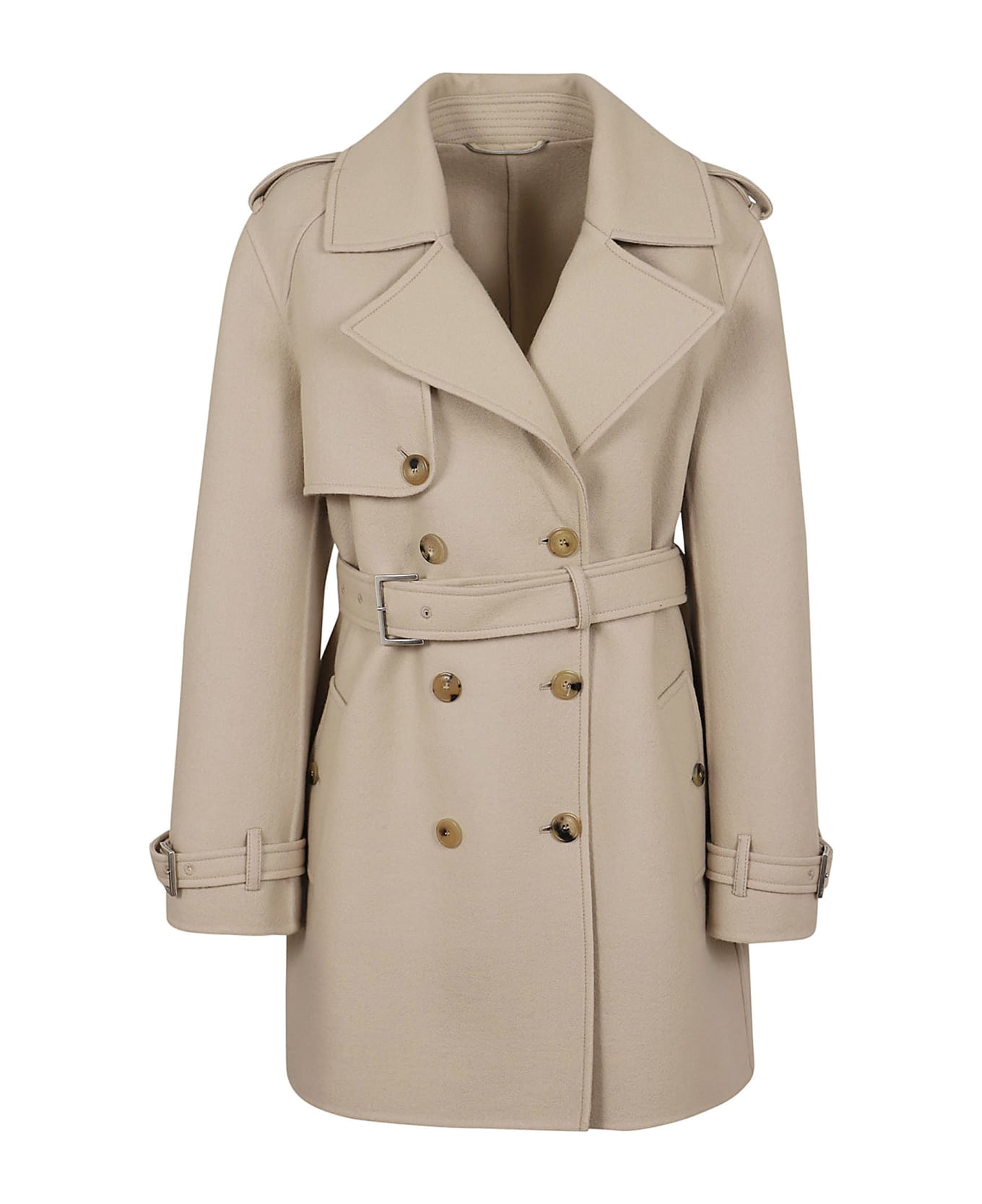 Pure wool coat BY ERMANNO SCERVINO. Trench model; double-breasted closure with buttons and belt; pointed lapels; two slanted side pockets.