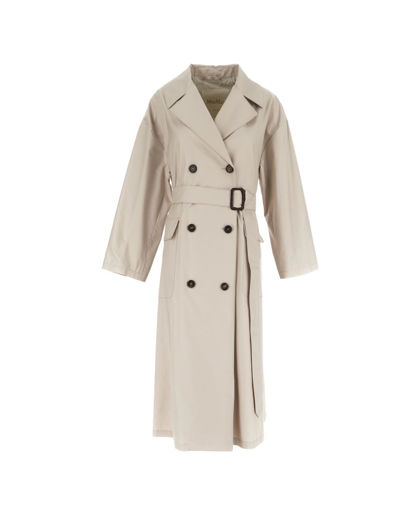 Max Mara The Cube water-repellent trench coat in navy blue cotton with detached rear yoke, double-breasted button fastening , two side flap-adorned pockets, long sleeves, lapel collar and buckle-embellished metching belt