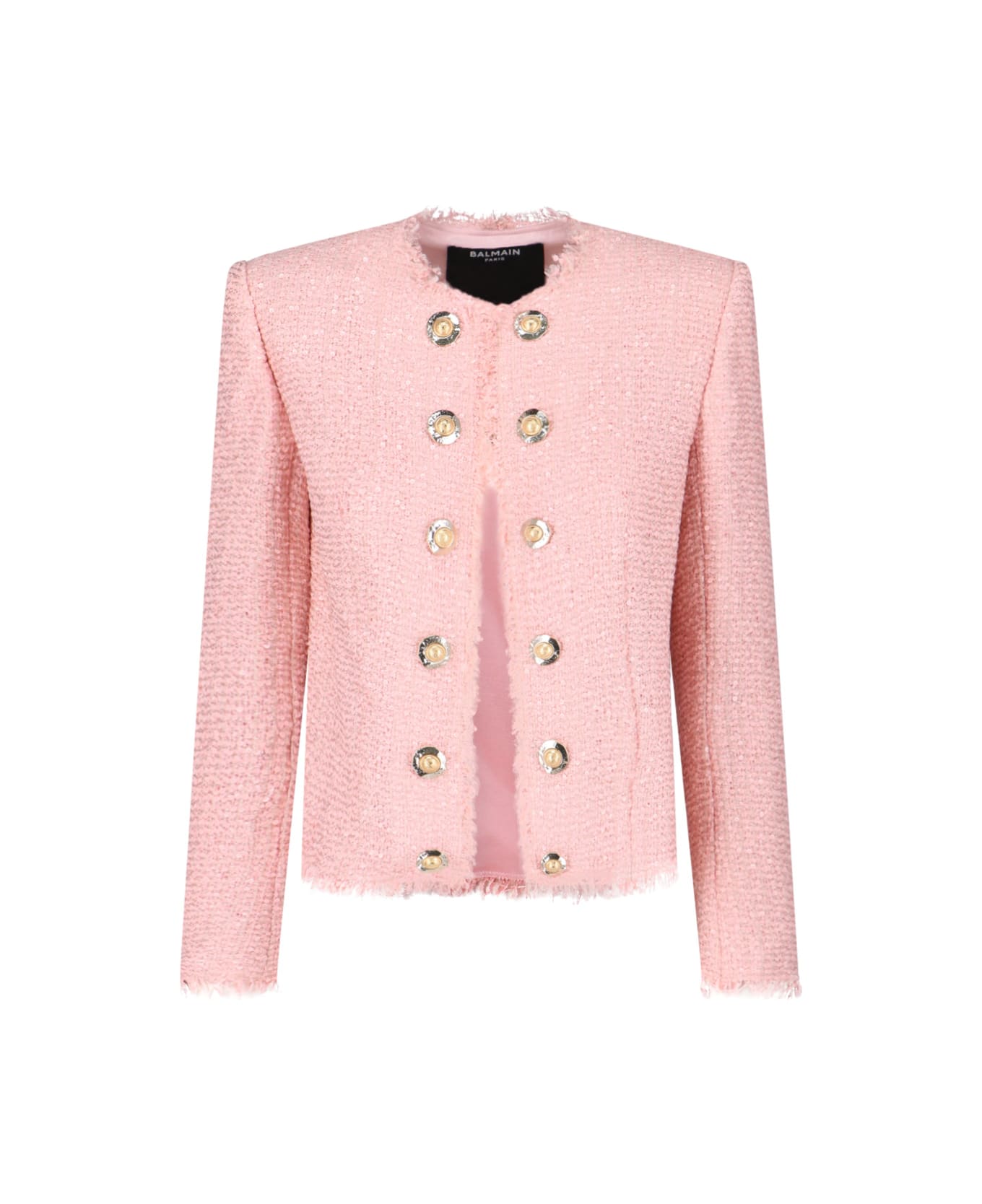 Balmain sequin tweed jacket in pink fabric with all-over sequins, crew neck, structured shoulders, hook and decorative button closure, raw cut hem, button cuffs, straight hem.