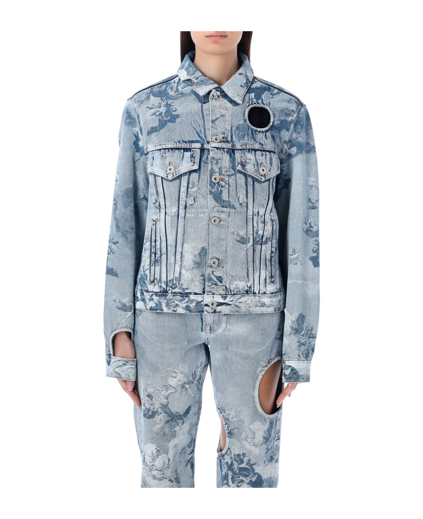 Cotton Sky Meteor Regular Jacket By Off-white. Featuring: Point Collar Front Button Fastening Flap Pockets With Button Closure Vertical Slit Pockets Cut-out Details Jacquard Motif Throughout Straight Hem With Adjustable Straps Model Is 1,72 M Tall And She Is Wearing Size 40