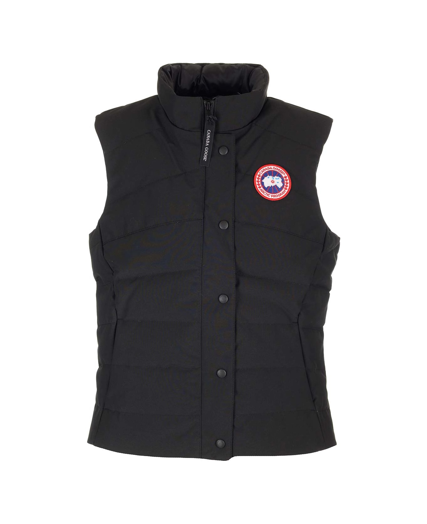 Freestyle padded nylon vest from Canada Goose, with high padded collar, zip and button closure, lower zip pockets. Composition: LADIES FREESTYLE VEST SHELL: 84% POLYESTER 16% COTTON, LINING: 100% POLYESTER, WOVEN, DOWN FILLED