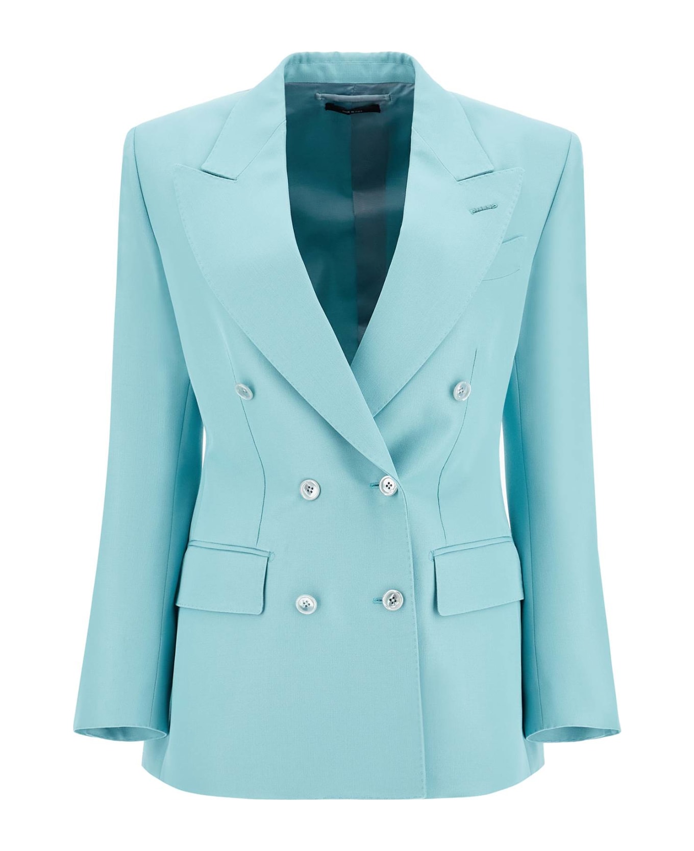 The Tom Ford double-breasted jacket has a slim fit and features a six-button design. Made from wool and viscose hopsack, it boasts peak lapels, two flap pockets, a chest pocket, and a central back vent. The interior is lined with two pockets. The model is 177 cm tall and wears an Italian size 40.