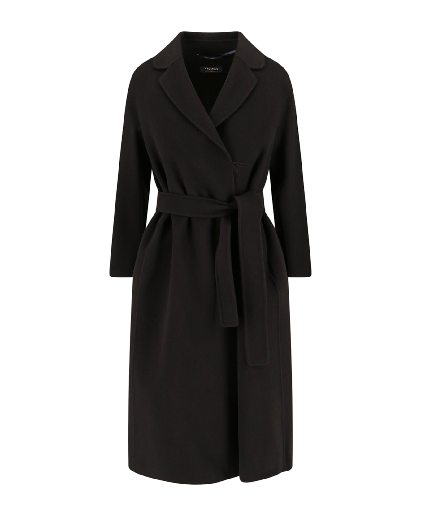 Black 'Esturia' Max Mara virgin wool coat with classic lapels, adjustable belt at the waist, two side pockets, straight hem.