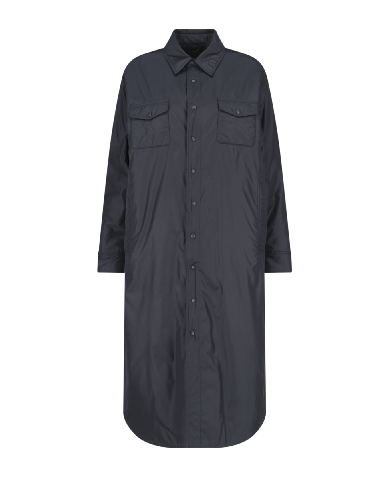 Aspesi waterproof single-breasted coat in black nylon with classic collar, button closure, button cuffs, two chest button flap pockets, two side welt pockets, side logo label, back pin tucks, straight hem.
